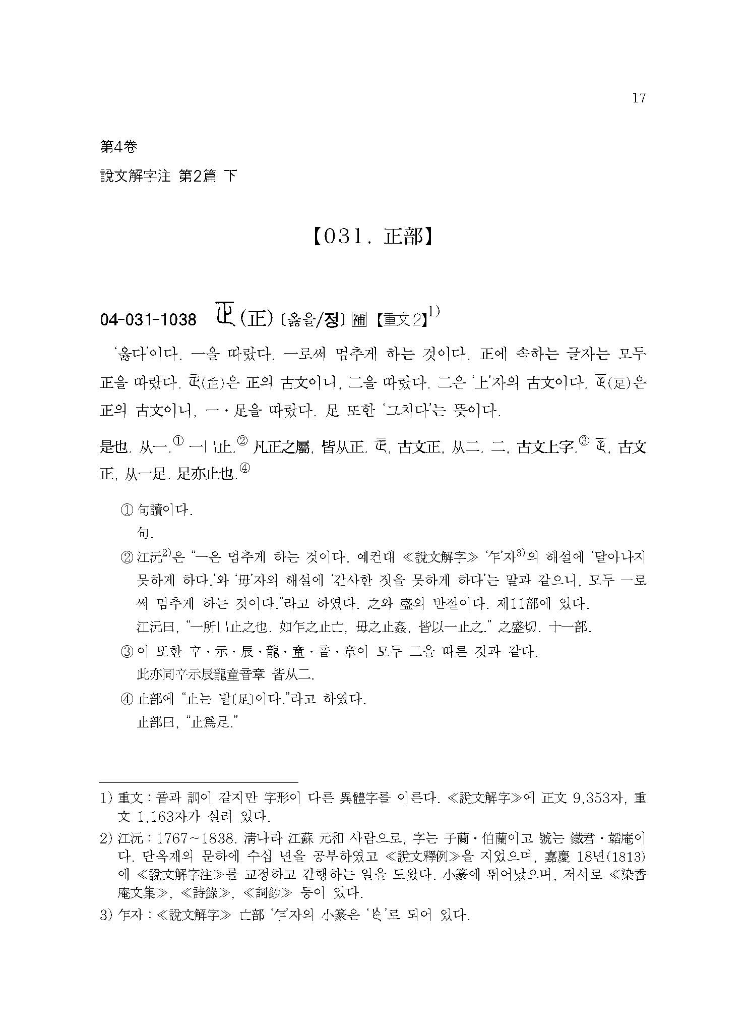 ‘옳다’이다. 一을 따랐다. 一로써 멈추게 하는 것이다. 正에 속하는 글자는 모두 正을 따랐다. (?)은 正의 古文이니, 二을 따랐다. 二은 ‘上’자의 古文이다. (??)은 正의 古文이니, 一?足을 따랐다. 足 또한 ‘그치다’는 뜻이다.