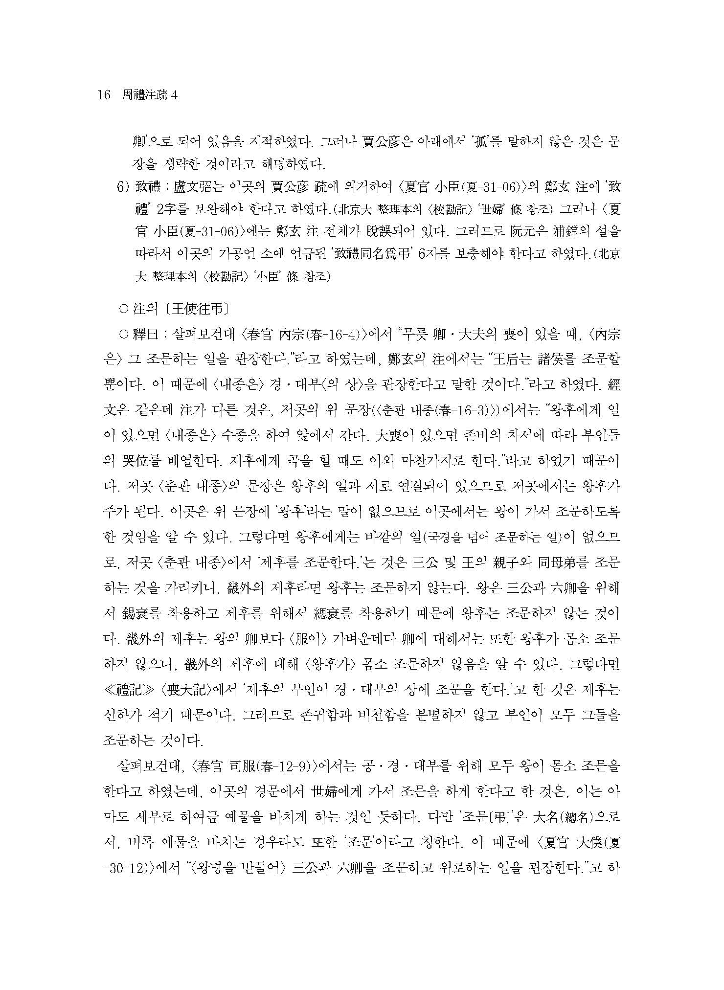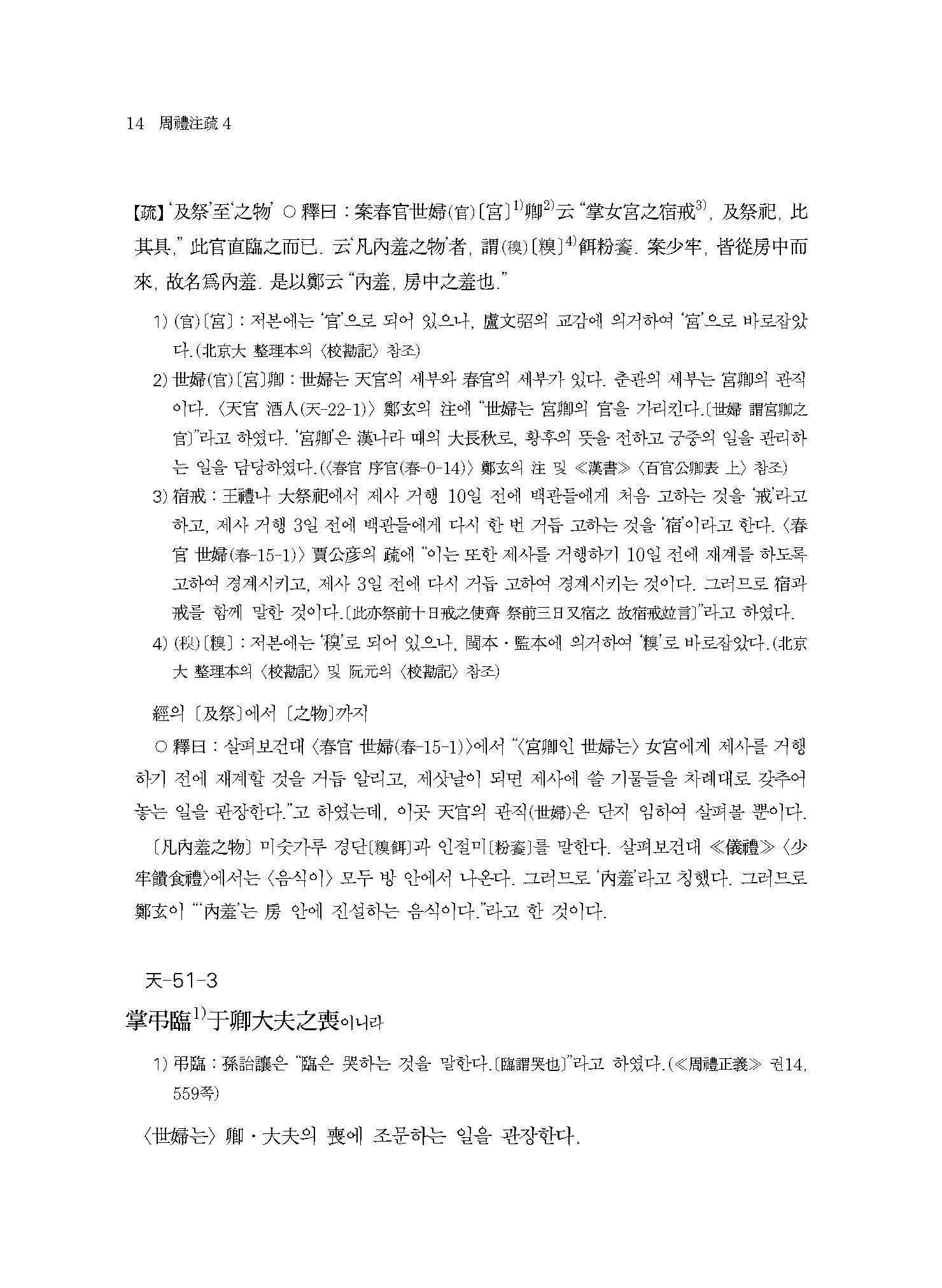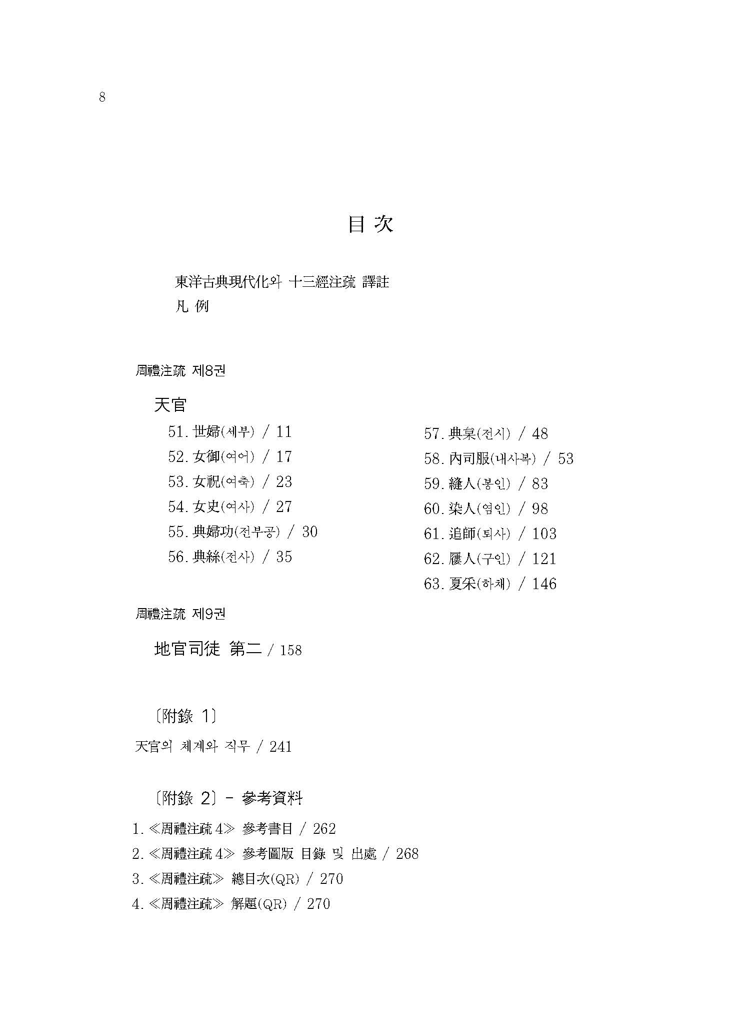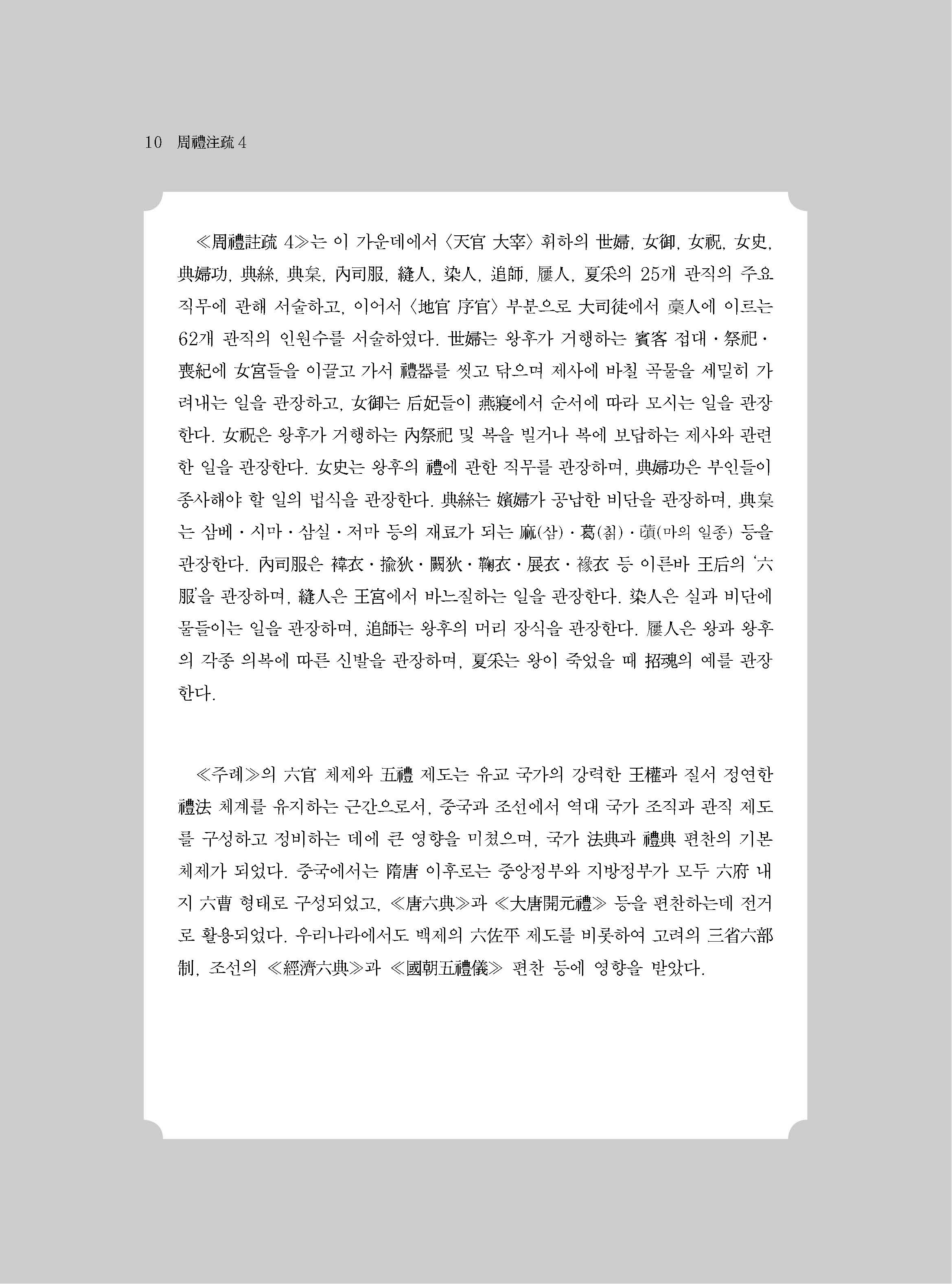 ≪역주 주례주소 4≫는 <천관天官 태재大宰> 휘하의 세부世婦, 여어女御, 여축女祝, 여사女史, 전부공典婦功, 전사典絲, 전시典?, 내사복內司服, 봉인縫人, 염인染人, 퇴사追師, 구인?人, 하채夏采의 25개 관직의 주요 직무에 관해 서술하고, 이어서 <지관地官 서관序官> 부분으로 대사도大司徒에서 고인?人에 이르는 62개 관직의 인원수를 서술하였다.
