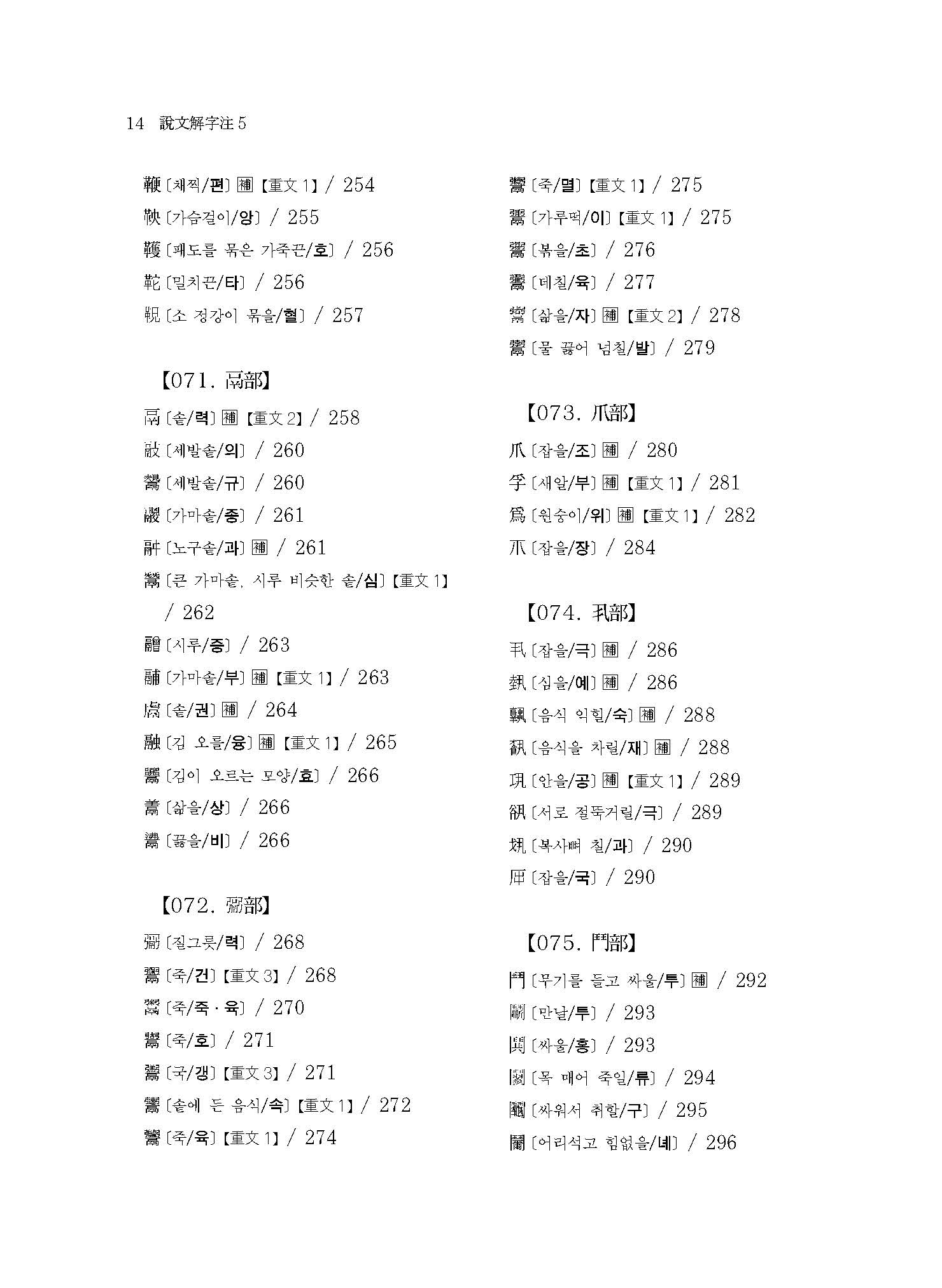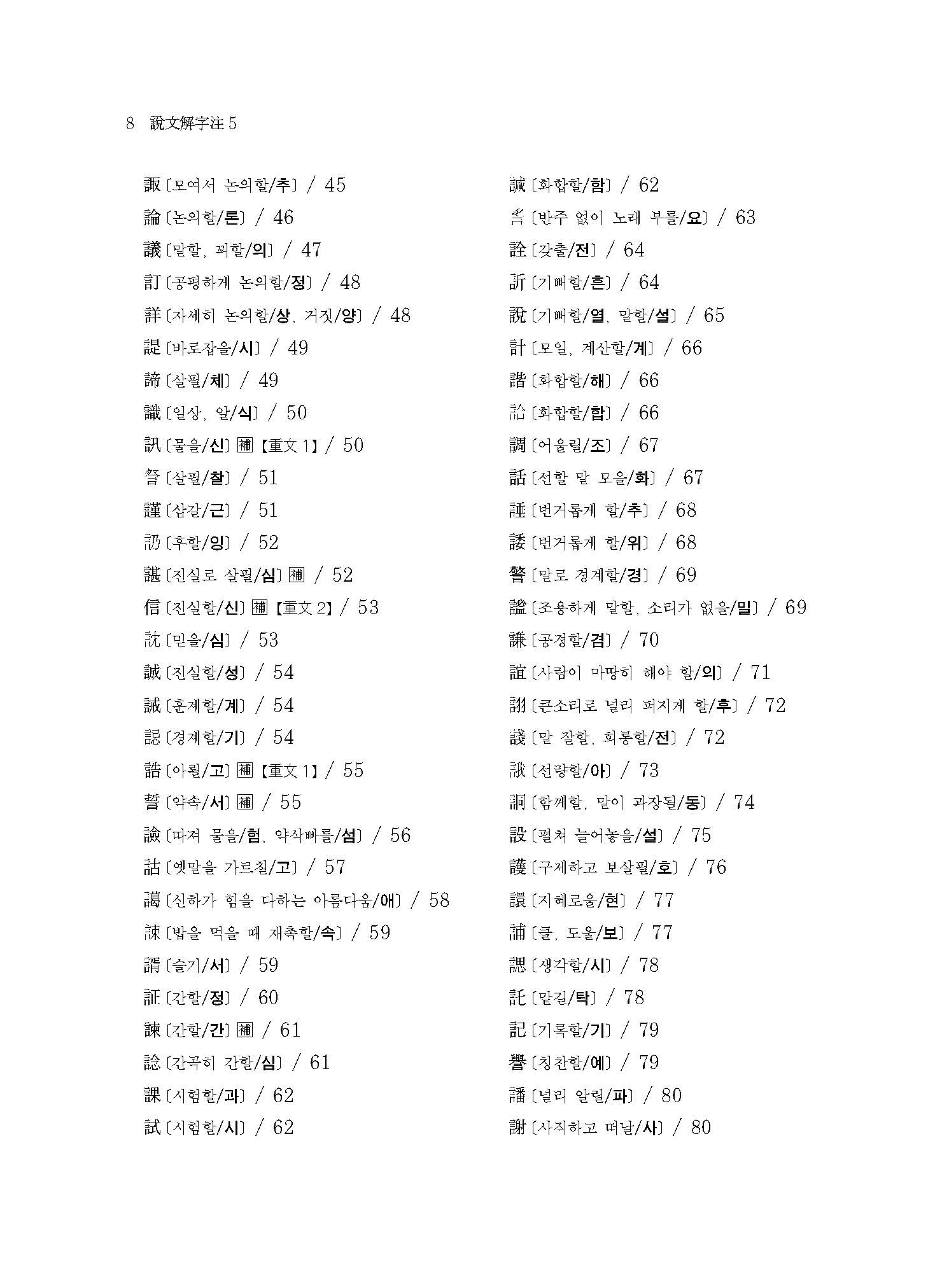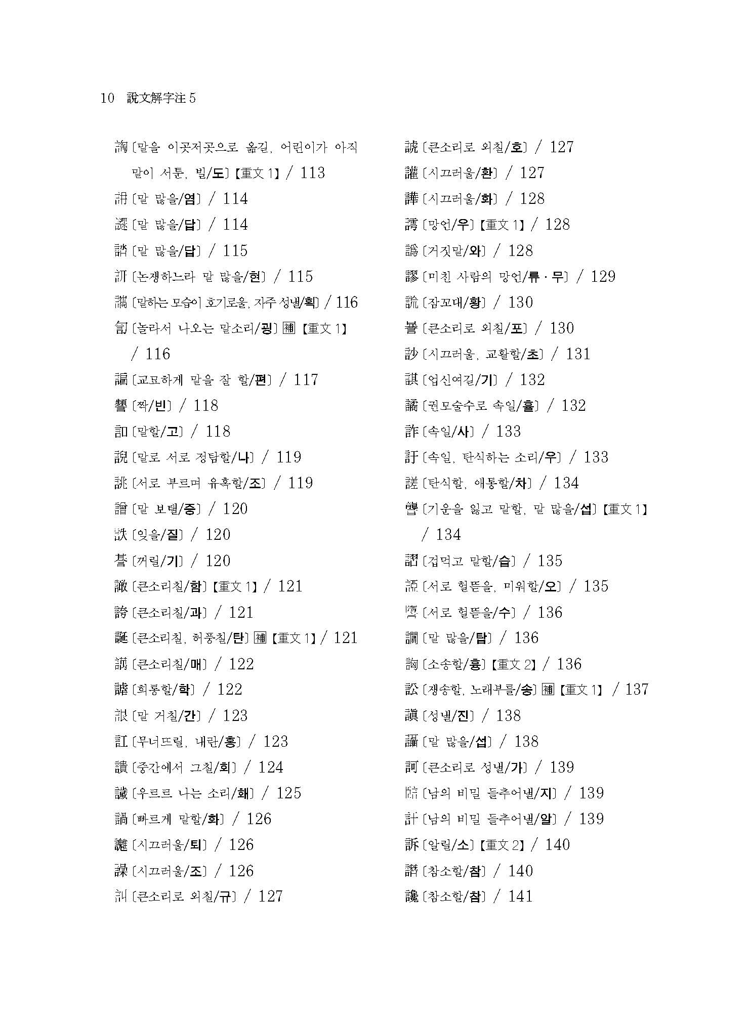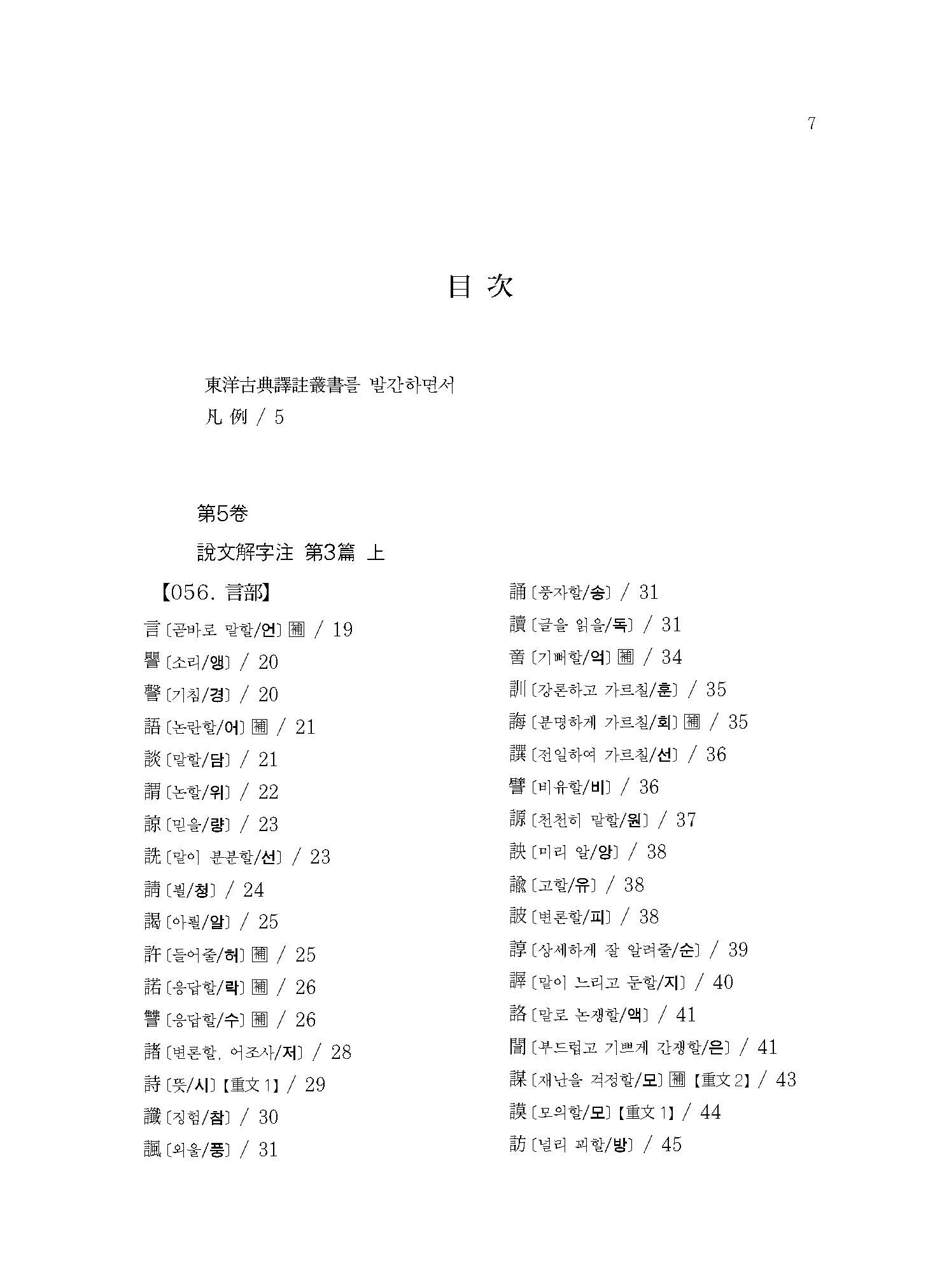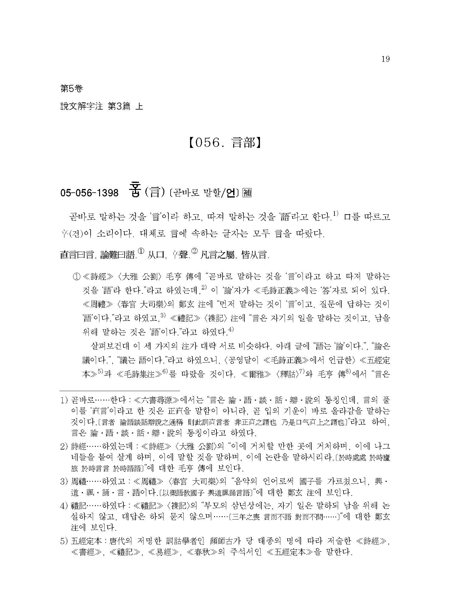 《설문해자주 5》는 ○○○자(言部~?部)의 표제자와 ○○○자의 보주(補註)가 실려 있다.