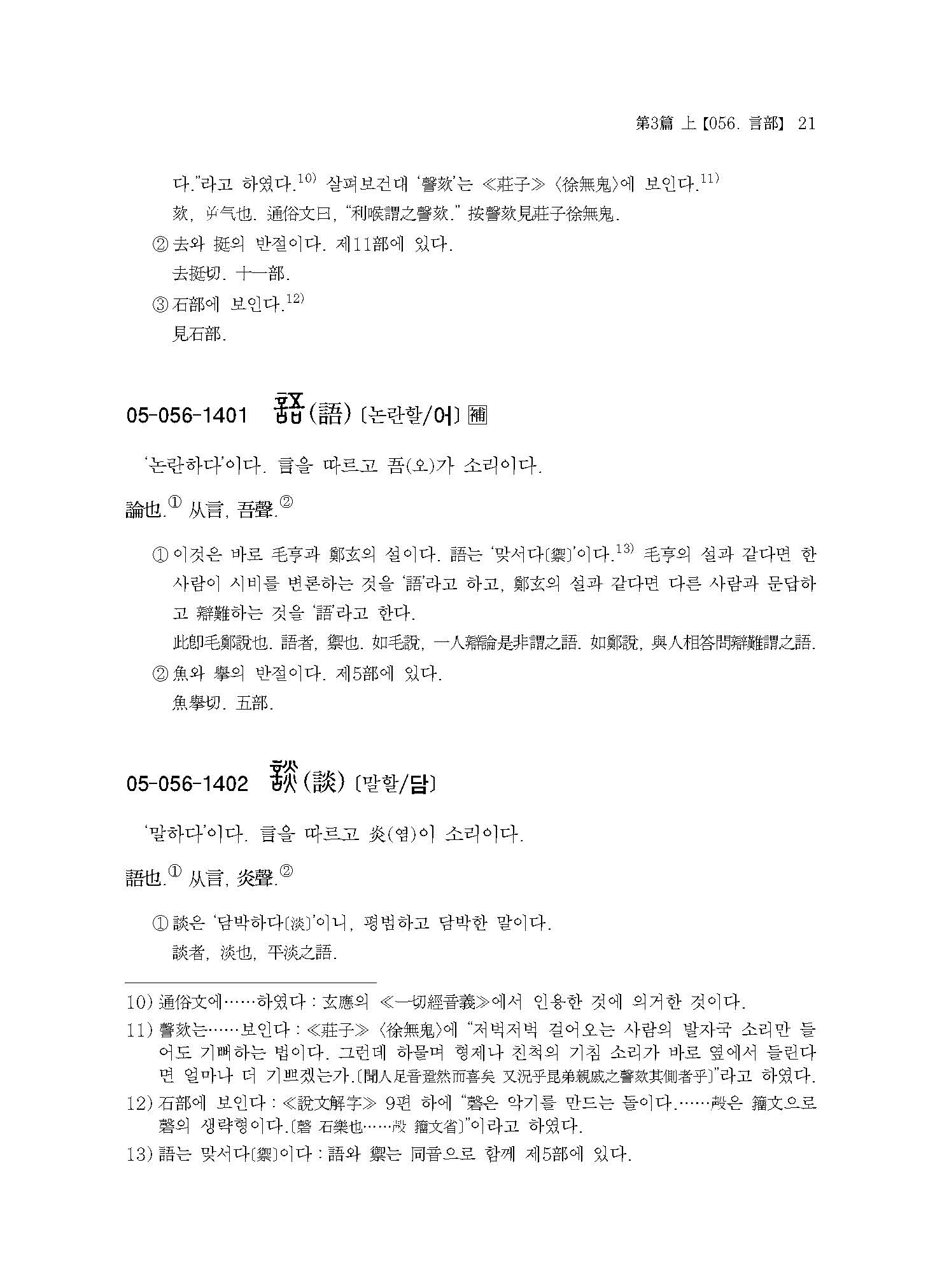 “곧바로 말하는 것을 ‘言’이라 하고, 따져 말하는 것을 ‘語’라고 한다. 口를 따르고 ?(건)이 소리이다. 대체로 言에 속하는 글자는 모두 言을 따랐다.[直言曰言, 論難曰語. ?口, ?聲. 凡言之屬, 皆?言.]”