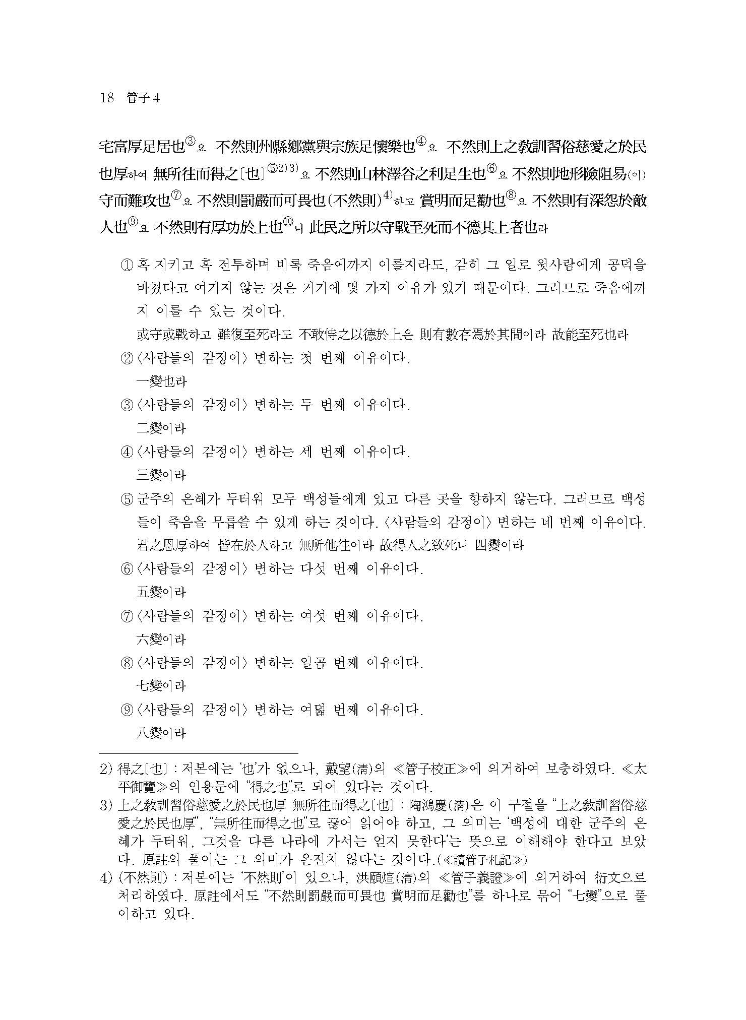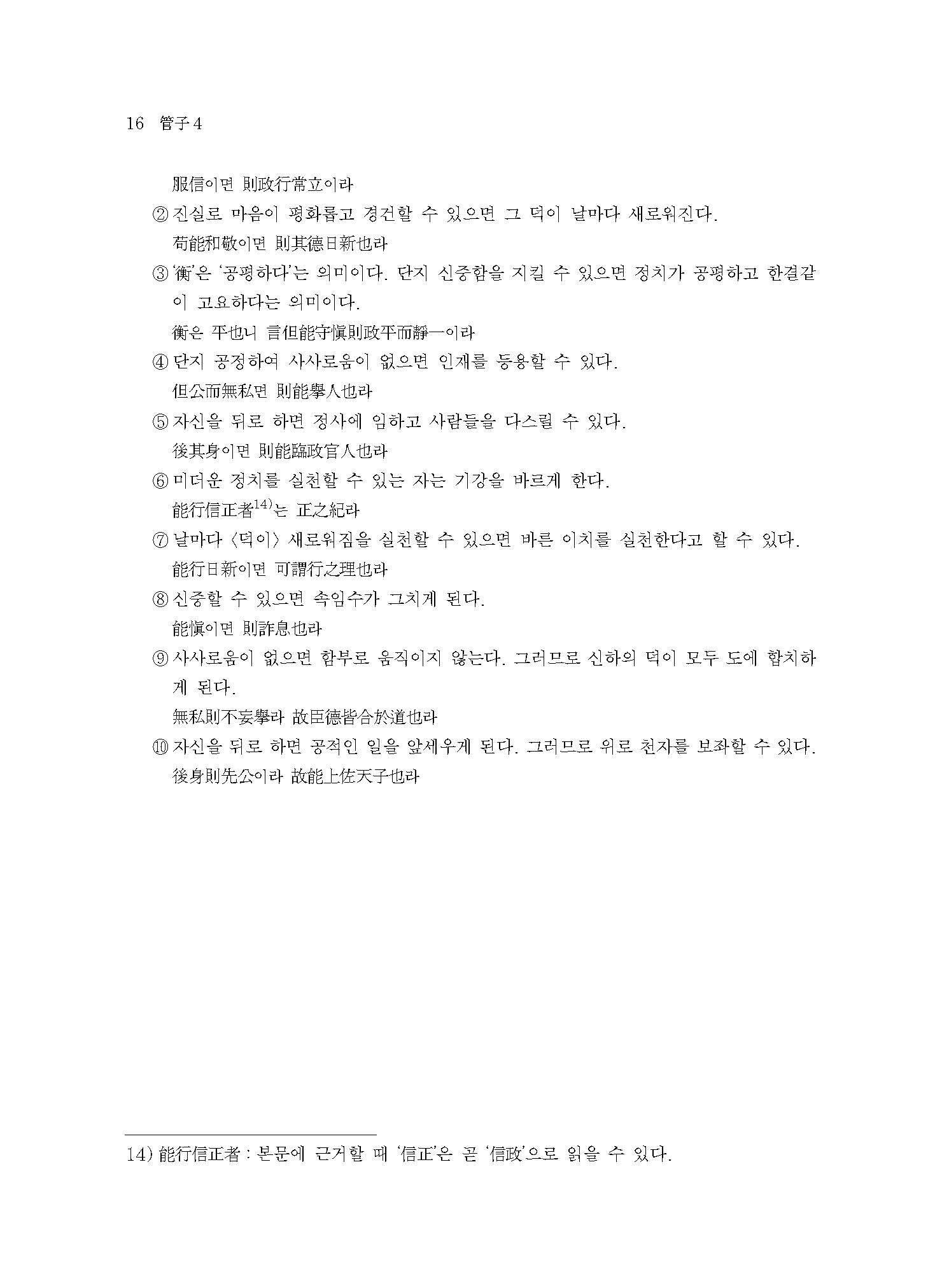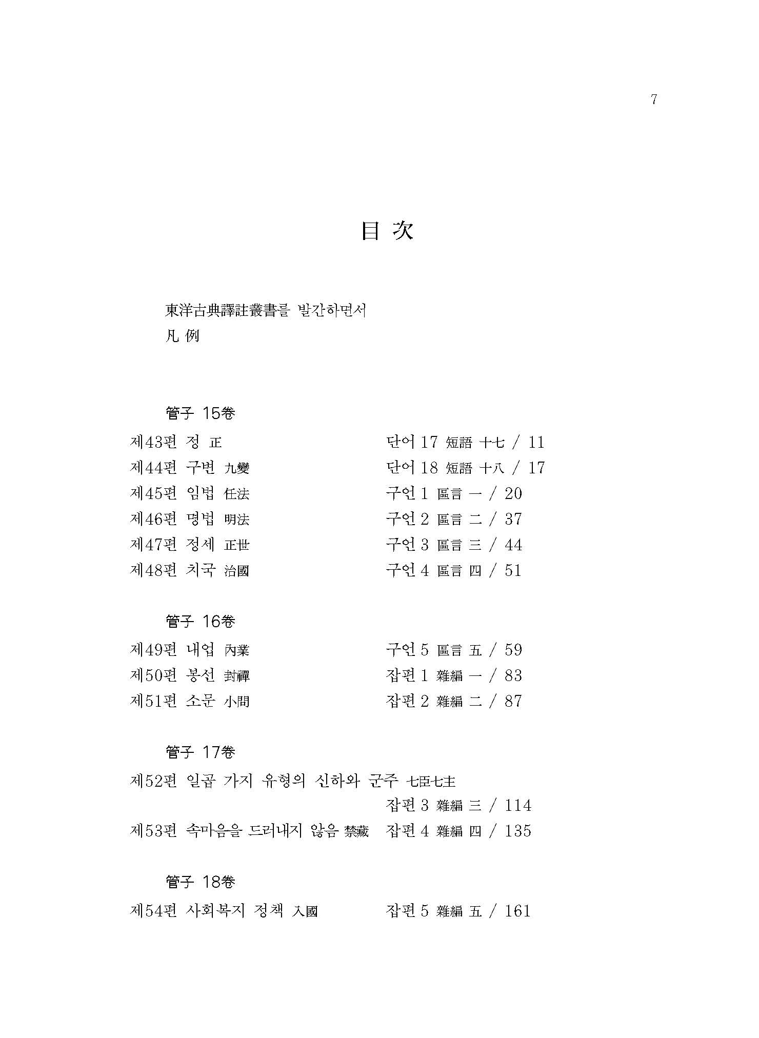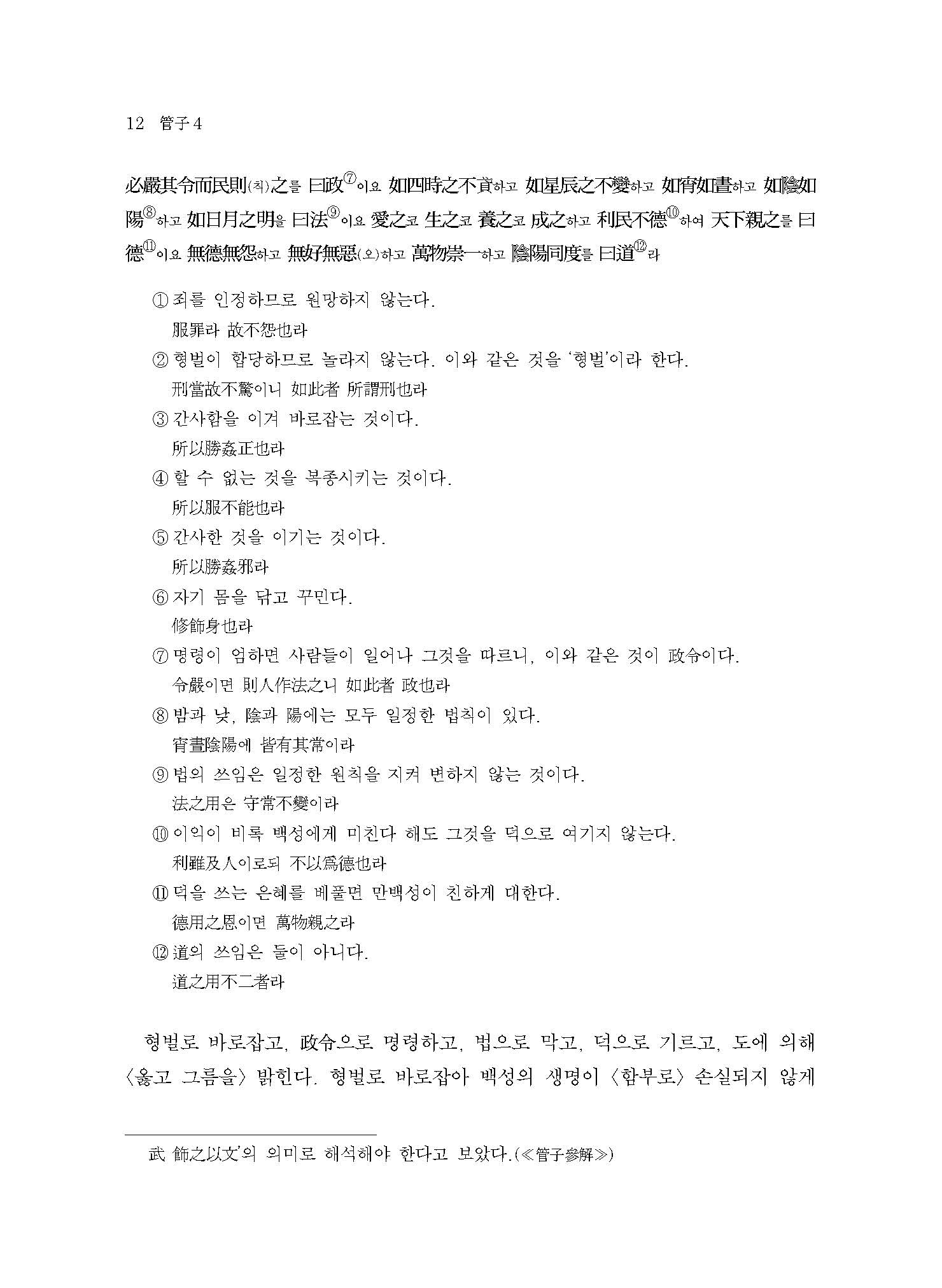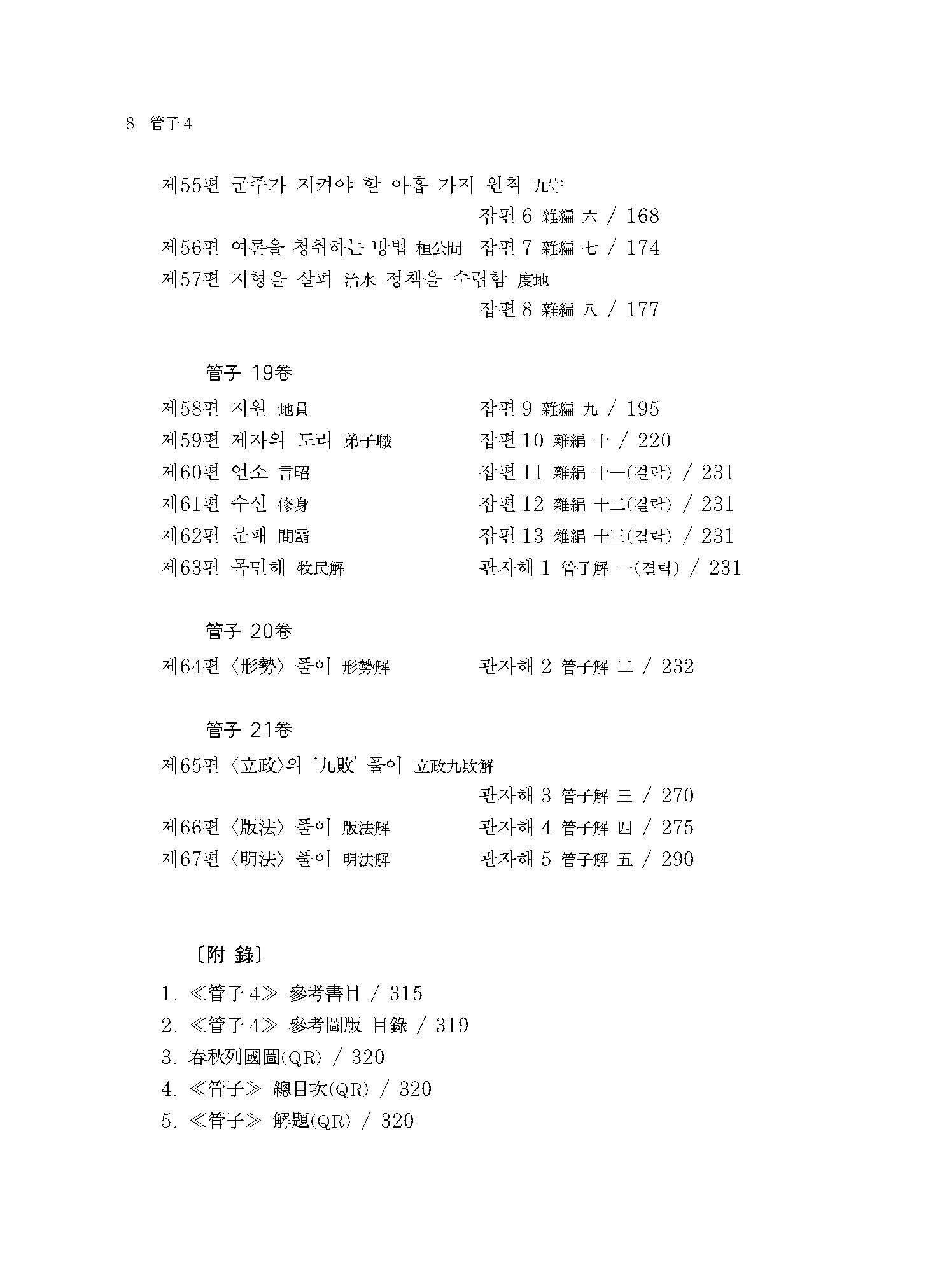 ≪관자≫는 본래 564편의 방대한 전적이었다고 한다. 그러나 당시의 ≪관자≫는 서로 중복되고 겹치는 부분들이 다수 포함되어 일정한 체계가 없었다. 이에 유향(劉向)이 왕명을 받아 체계적으로 정리하였다. 이번에 간행된 ≪역주 관자 4≫에는 ≪관자≫ 전체 86편(망실본 10편 포함) 중 군주가 백성을 바로잡는 문제를 논한 제43편 정(正)부터 공정한 법의 설치와 운용을 다룬 제67편 명법해(明法解)까지 수록하였다.