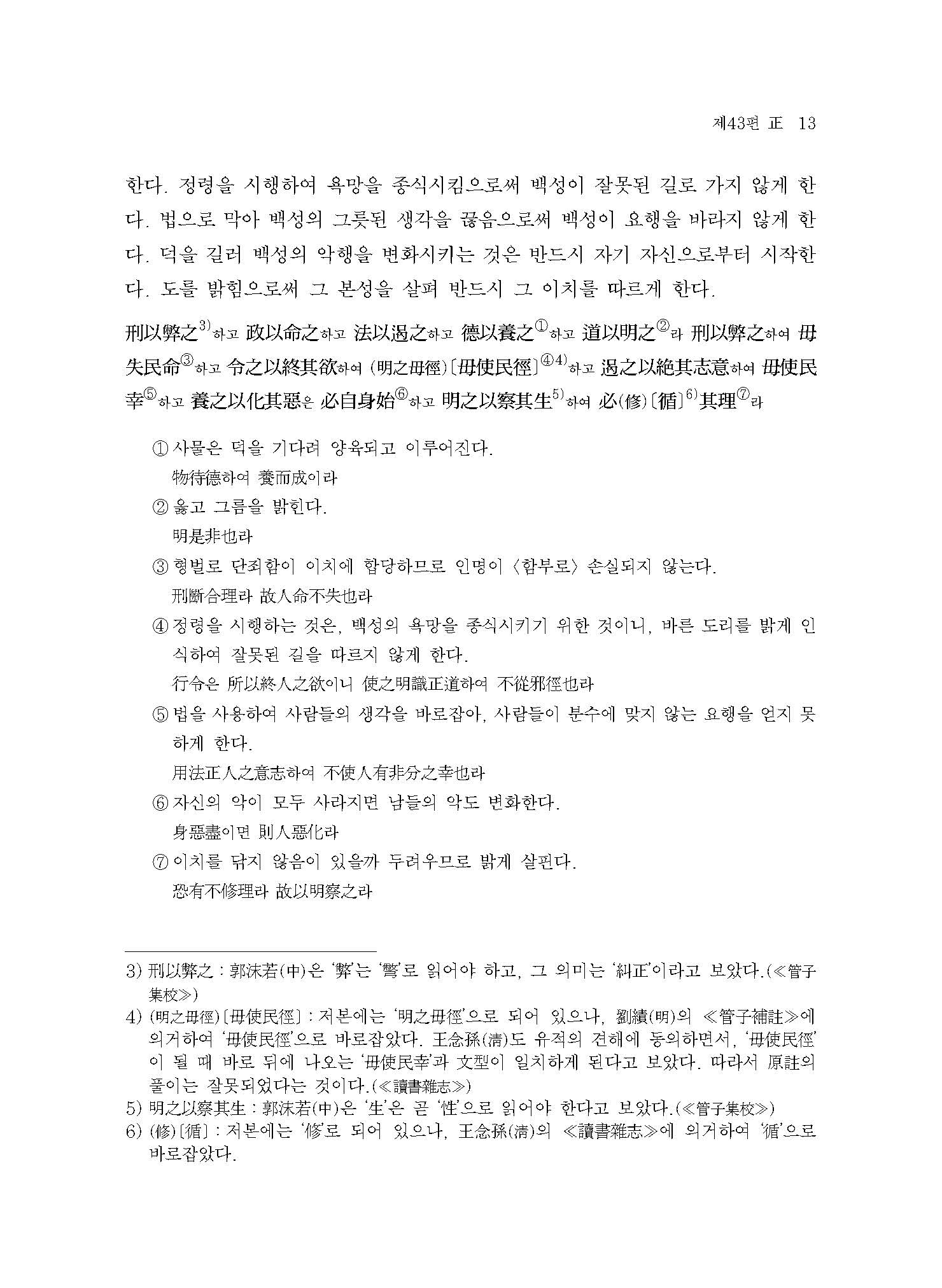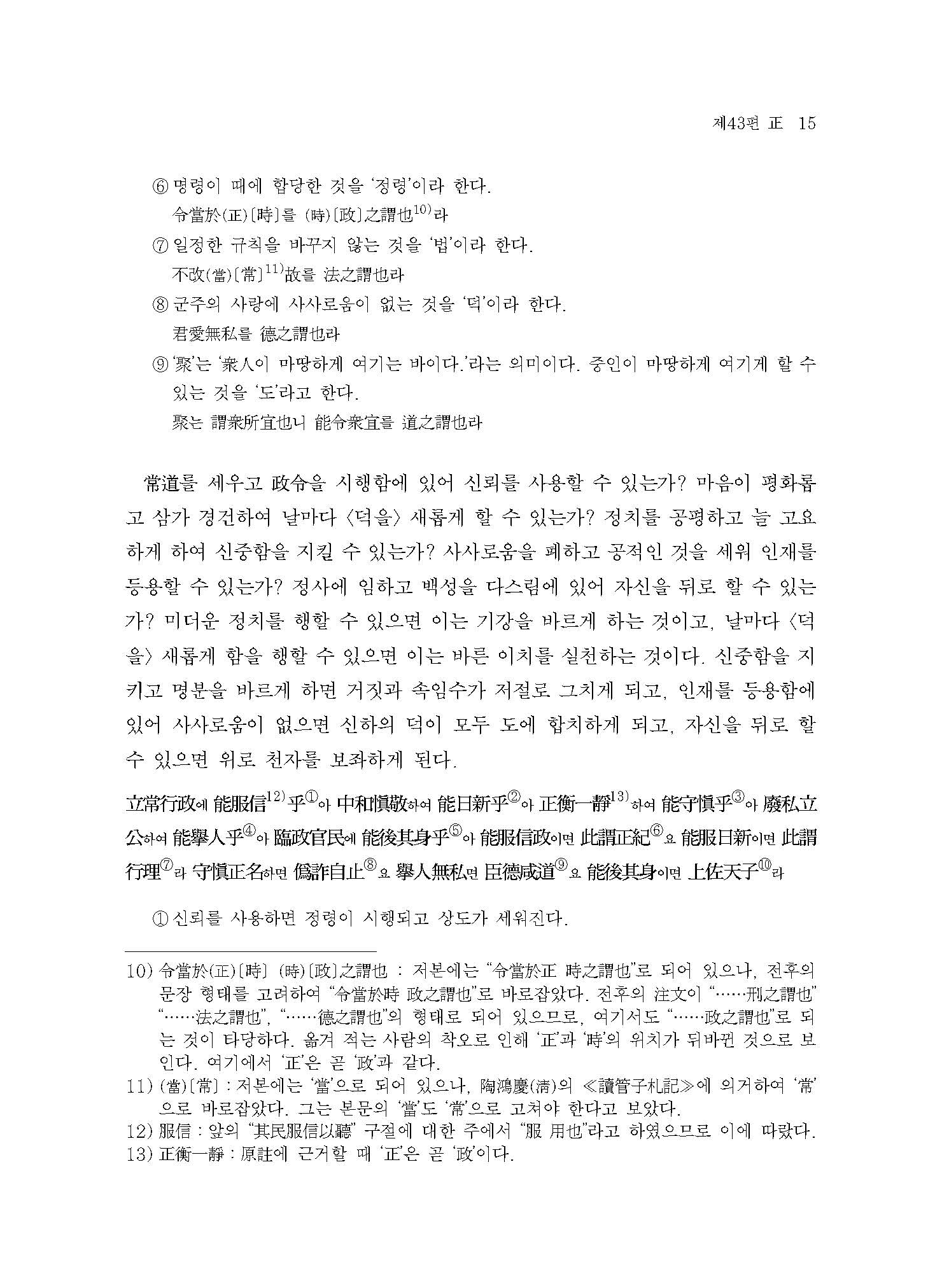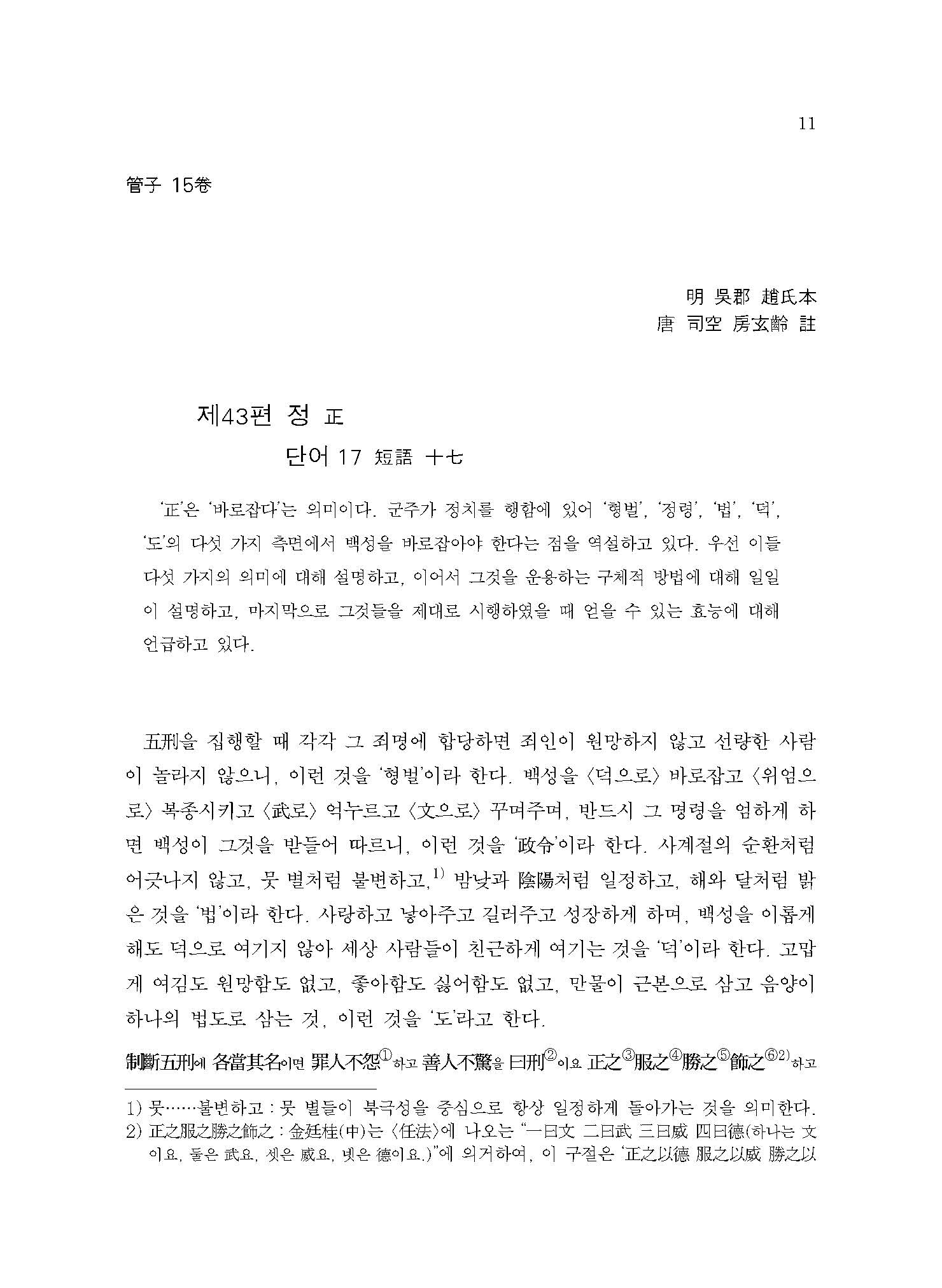 오형(五刑)을 집행할 때 각각 그 죄명에 합당하면 죄인이 원망하지 않고 선량한 사람이 놀라지 않으니, 이런 것을 ‘형벌’이라 한다. 백성을 덕으로 바로잡고 위엄으로 복종시키고 무(武)로 억누르고 문(文)으로 꾸며주며, 반드시 그 명령을 엄하게 하면 백성이 그것을 받들어 따르니, 이런 것을 ‘정령(政令)’이라 한다. 사계절의 순환처럼 어긋나지 않고, 뭇 별처럼 불변하고,뭇……불변하고:뭇 별들이 북극성을 중심으로 항상 일정하게 돌아가는 것을 의미한다.