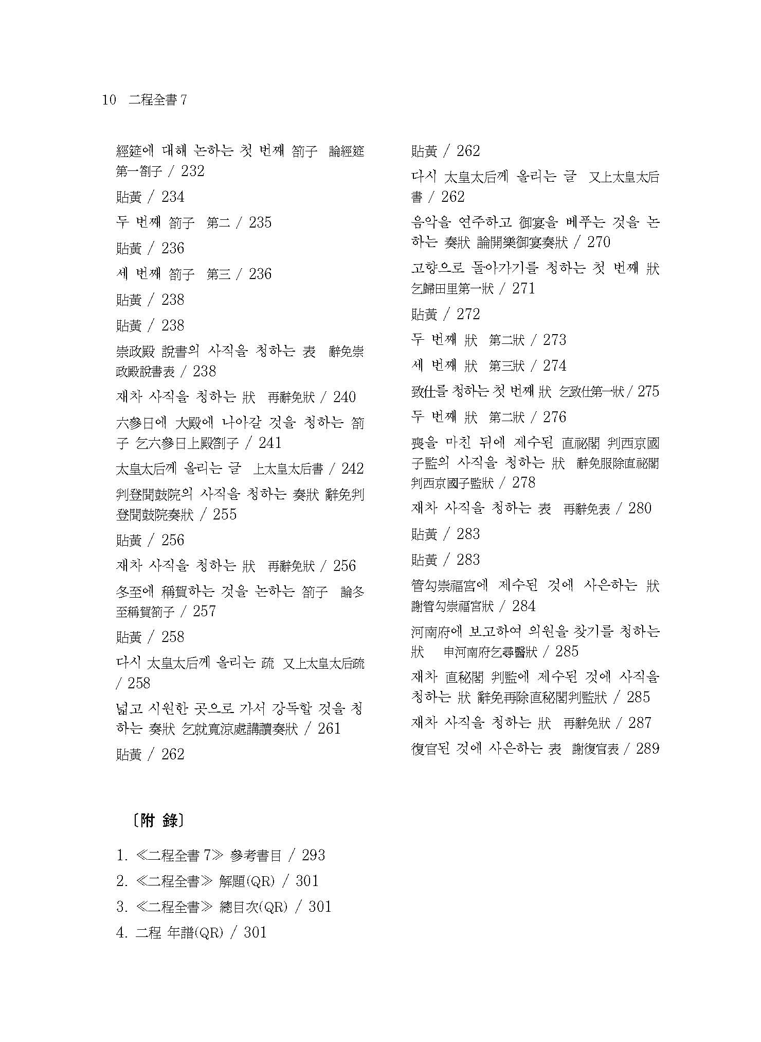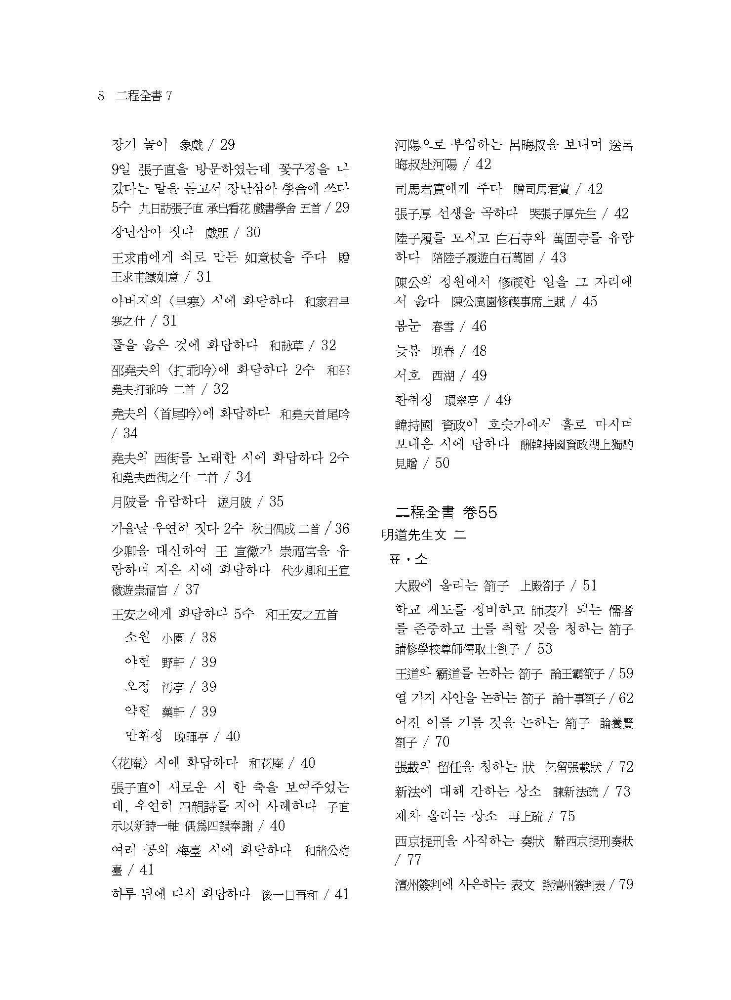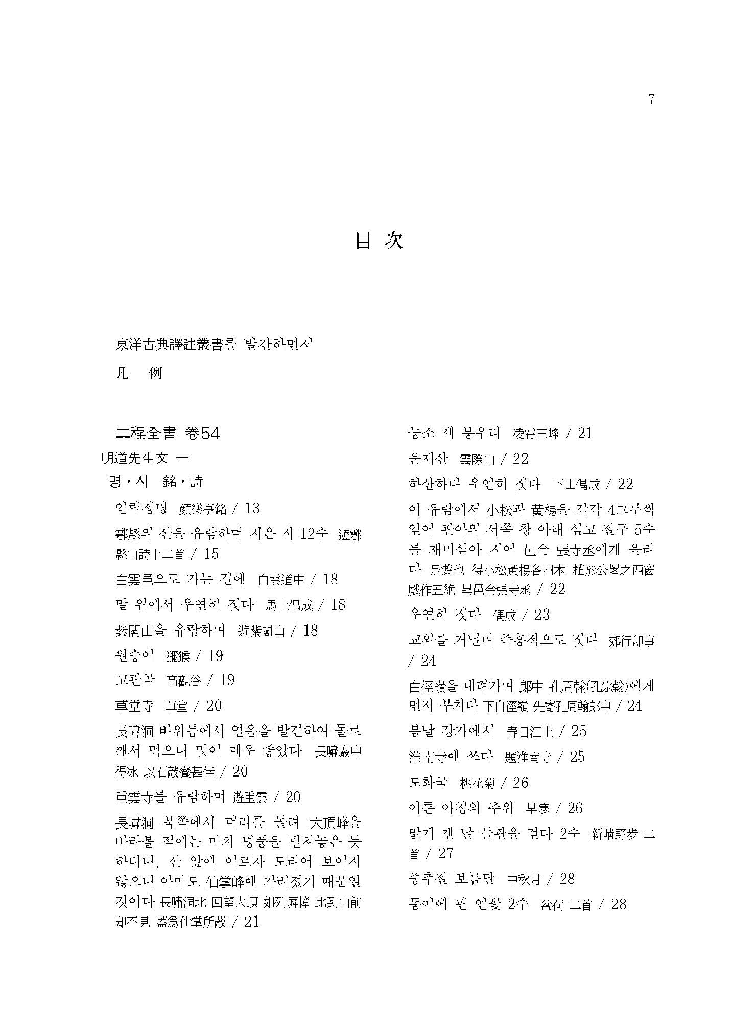 이번에 발간되는 ≪이정전서 7≫은 ≪명도문집明道文集≫ 전체와 ≪이천문집伊川文集≫ 일부(상서上書, 표表, 소疏)를 수록하였다. 경학經學의 테두리를 넘어서서 이정二程 형제의 폭넓은 사유 체계와 문학적 성취를 다양한 문체의 글들을 통해 접해보고자 하는 독자들에게 유용한 책이라고 할 수 있다.