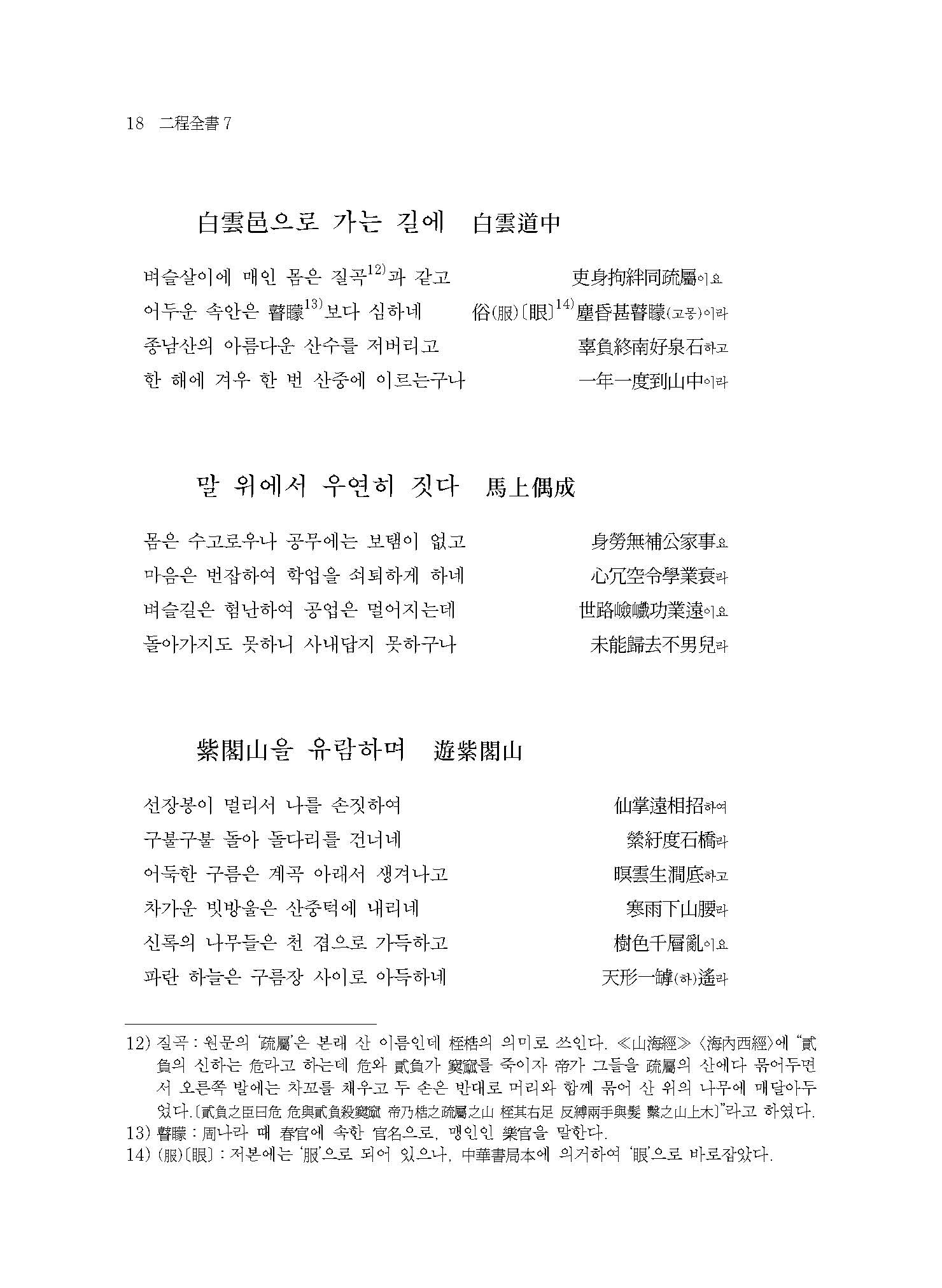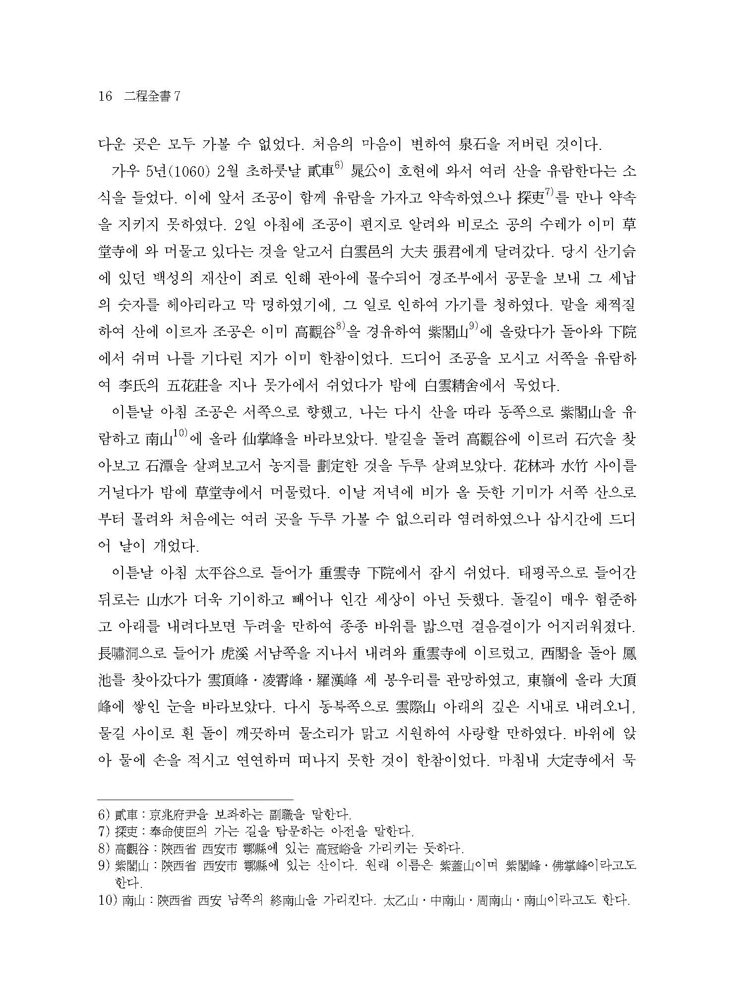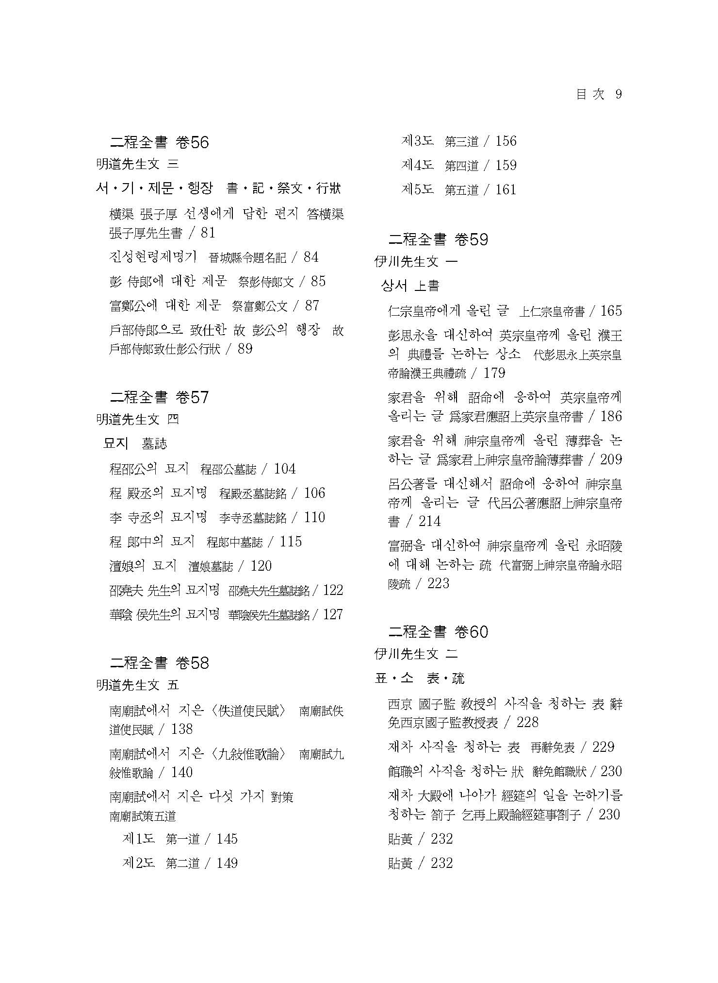 이번에 발간되는 ≪이정전서 7≫은 ≪명도문집明道文集≫ 전체와 ≪이천문집伊川文集≫ 일부(상서上書, 표表, 소疏)를 수록하였다. 경학經學의 테두리를 넘어서서 이정二程 형제의 폭넓은 사유 체계와 문학적 성취를 다양한 문체의 글들을 통해 접해보고자 하는 독자들에게 유용한 책이라고 할 수 있다.
