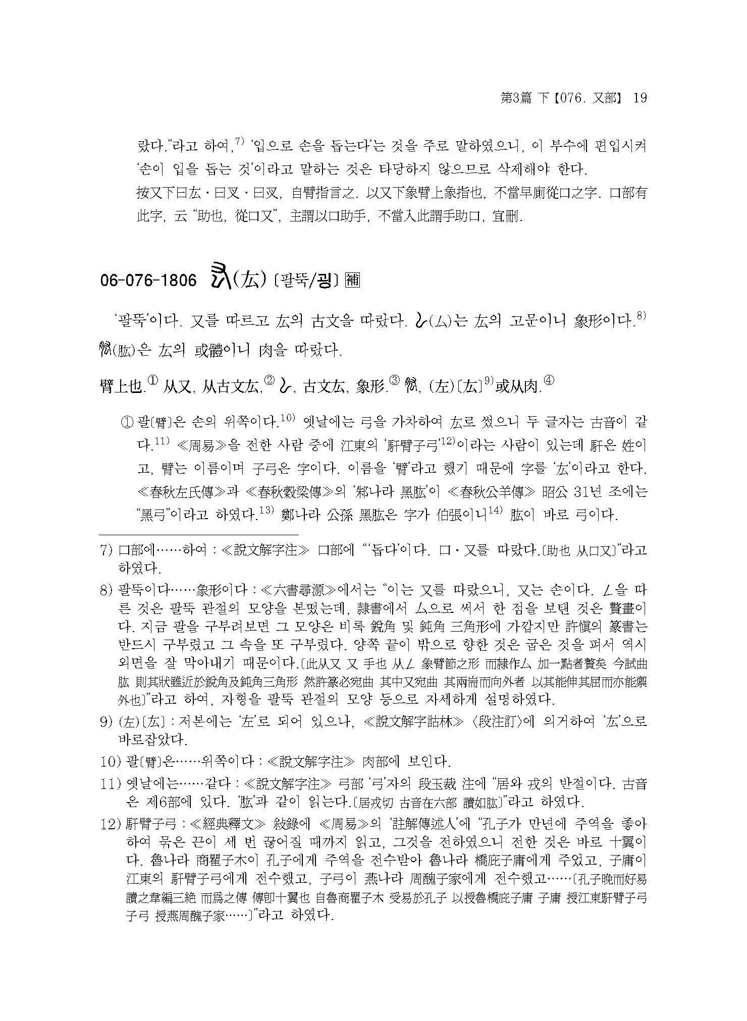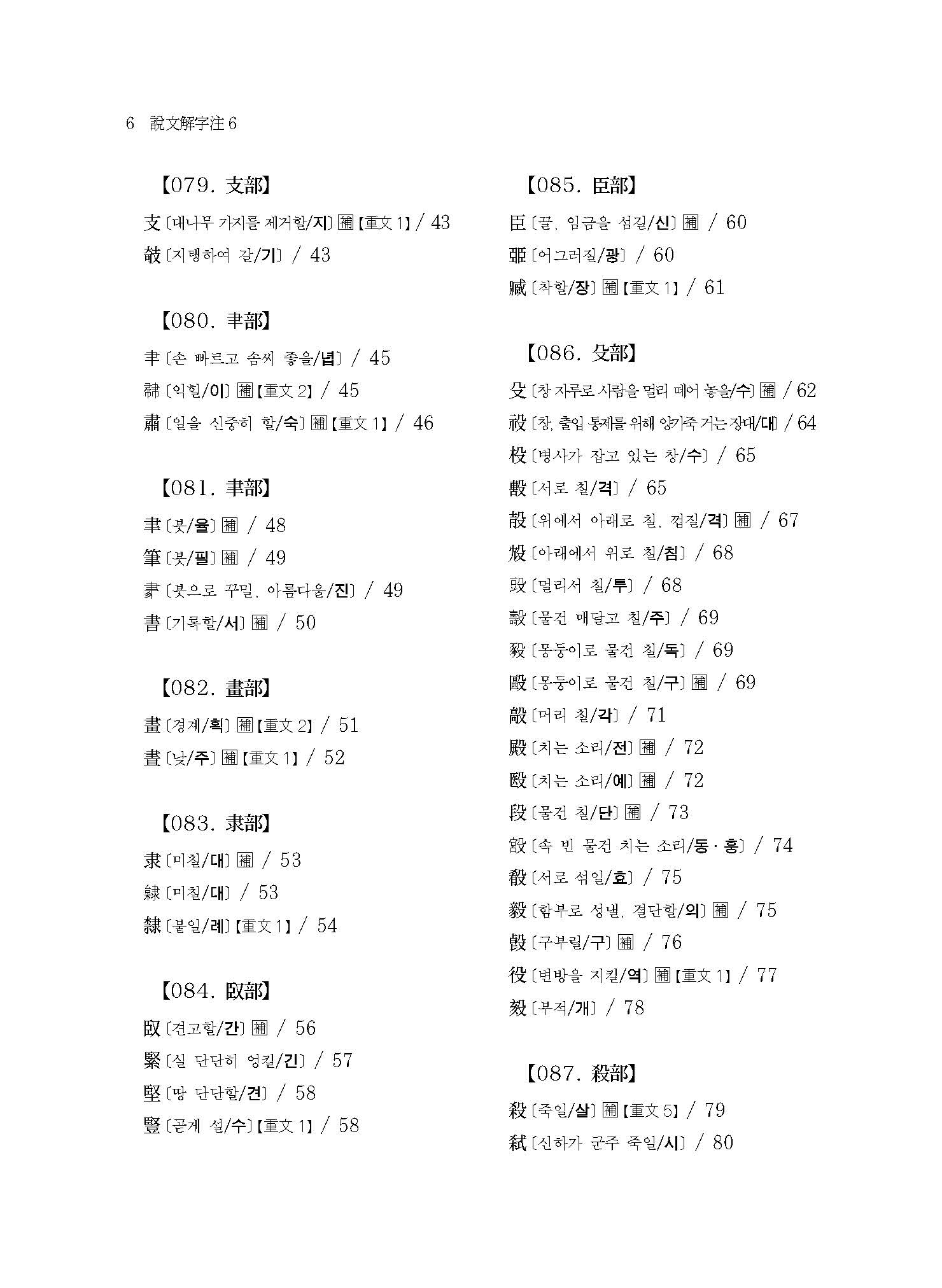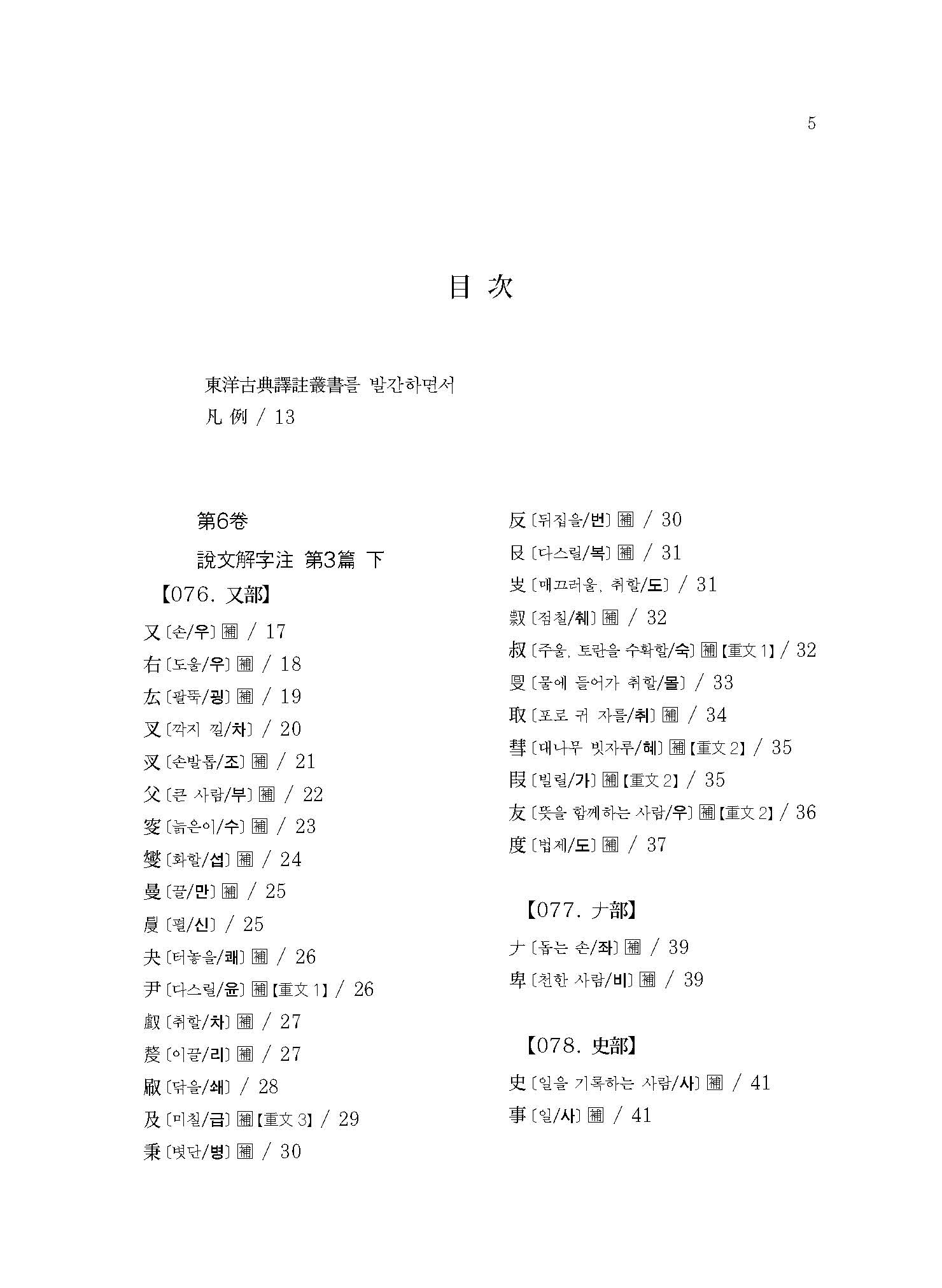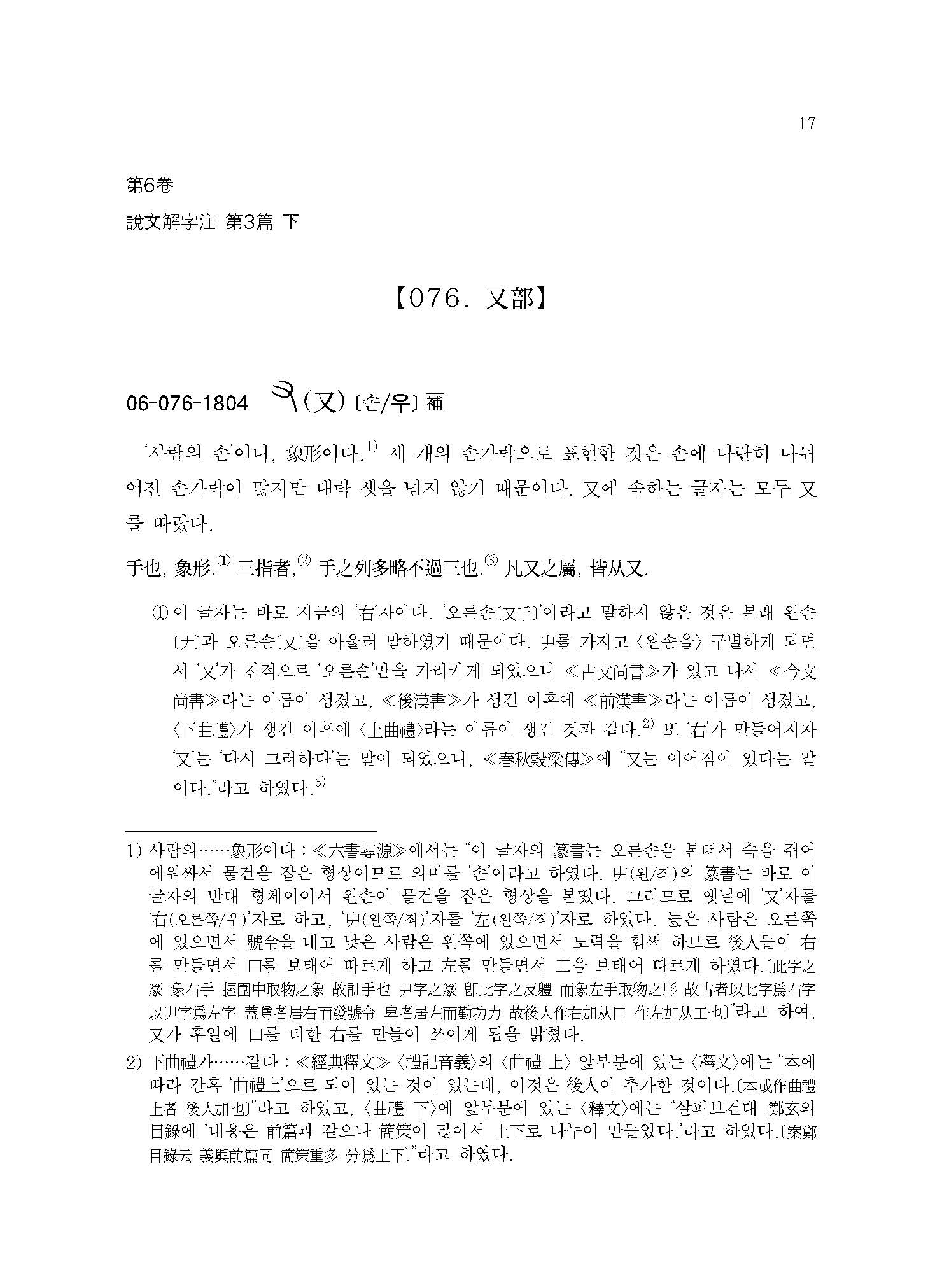예컨대 본서에 실린 “【076. 又部】【077. ??部】【078. 史部】【079. 支部】【080. ??部】【081. 聿部】”의 경우 손의 모양 또는 손에 어떤 물건을 쥔 모양이다. 이러한 부수배열이 《설문해자》 전반에 걸쳐 적용되어 《설문해자》 전체가 하나의 쇠사슬처럼 서로 연결되어 있다.