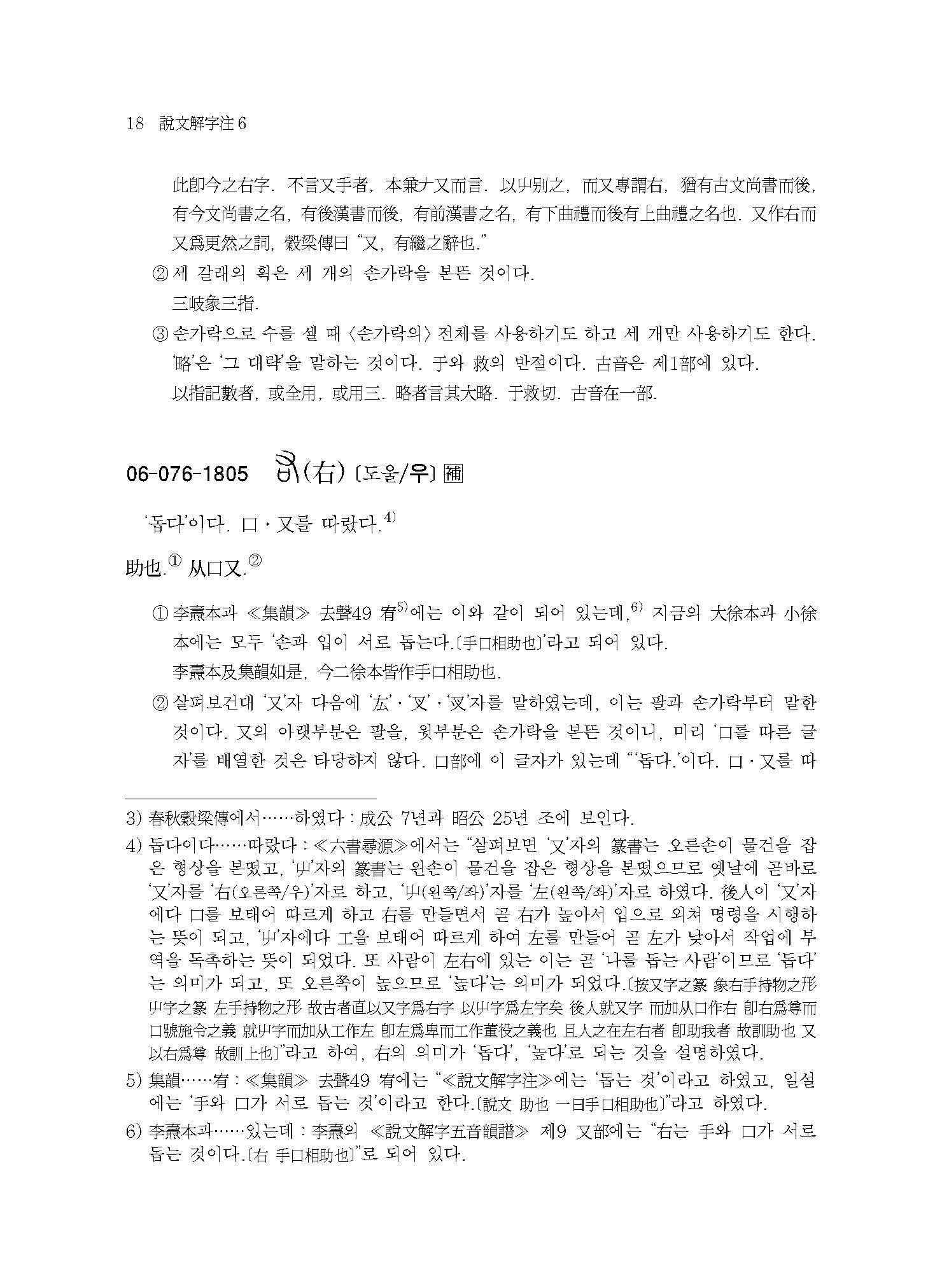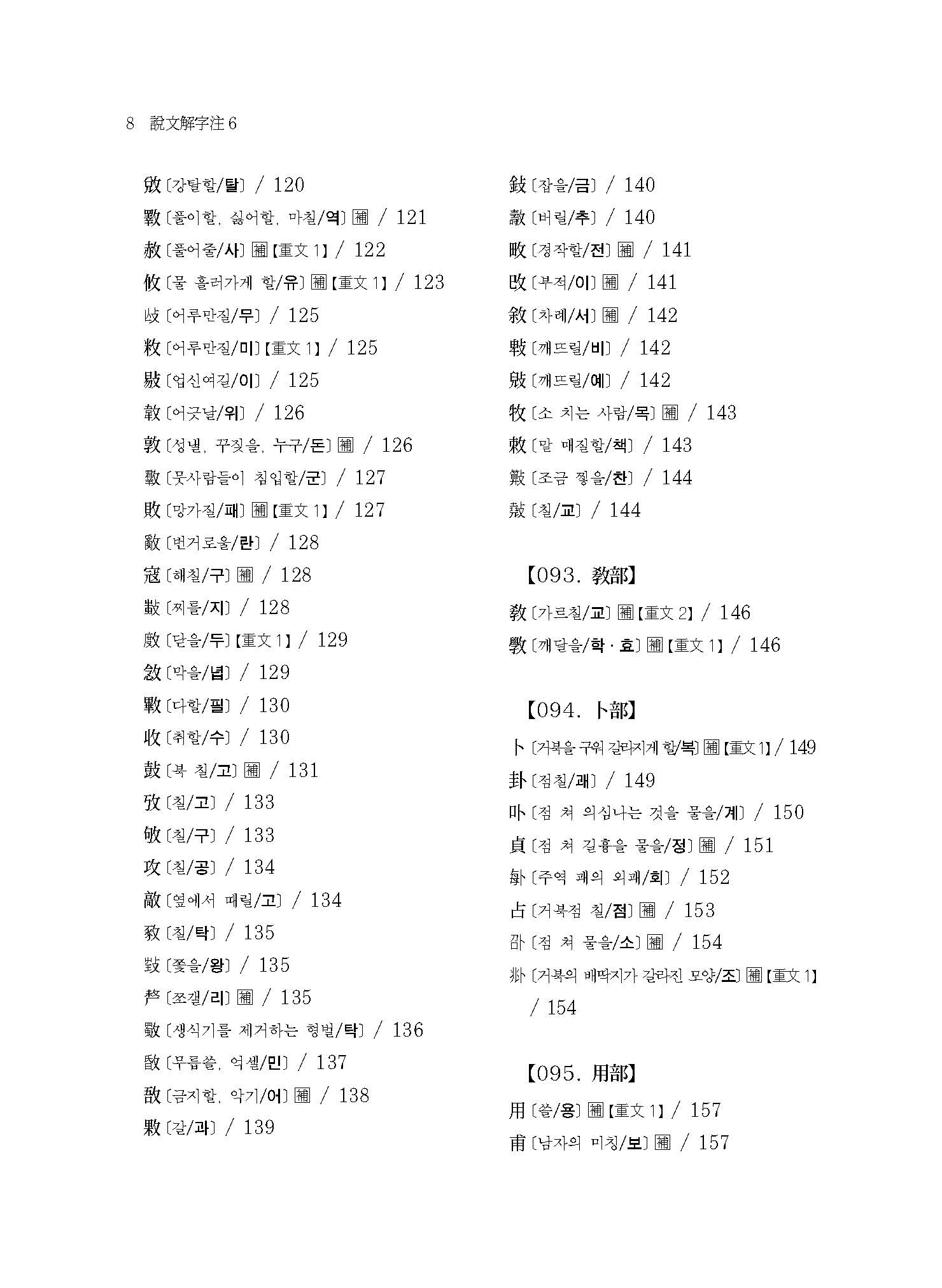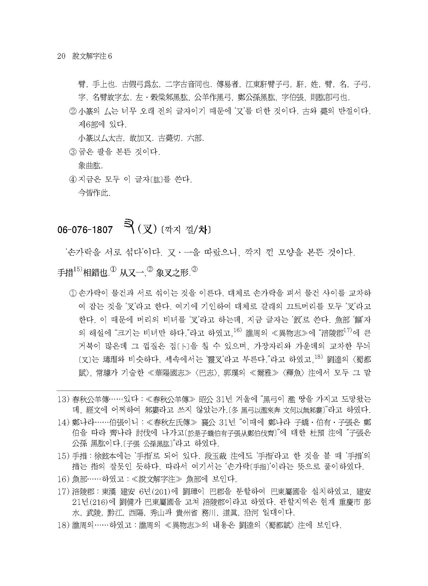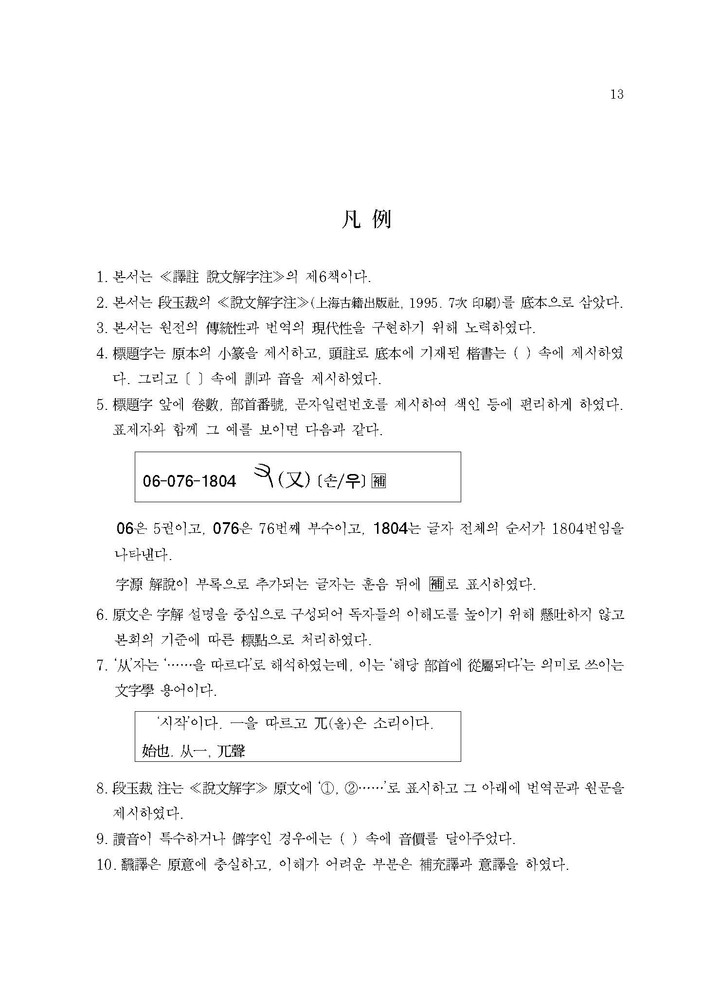 예컨대 본서에 실린 “【076. 又部】【077. ??部】【078. 史部】【079. 支部】【080. ??部】【081. 聿部】”의 경우 손의 모양 또는 손에 어떤 물건을 쥔 모양이다. 이러한 부수배열이 《설문해자》 전반에 걸쳐 적용되어 《설문해자》 전체가 하나의 쇠사슬처럼 서로 연결되어 있다.