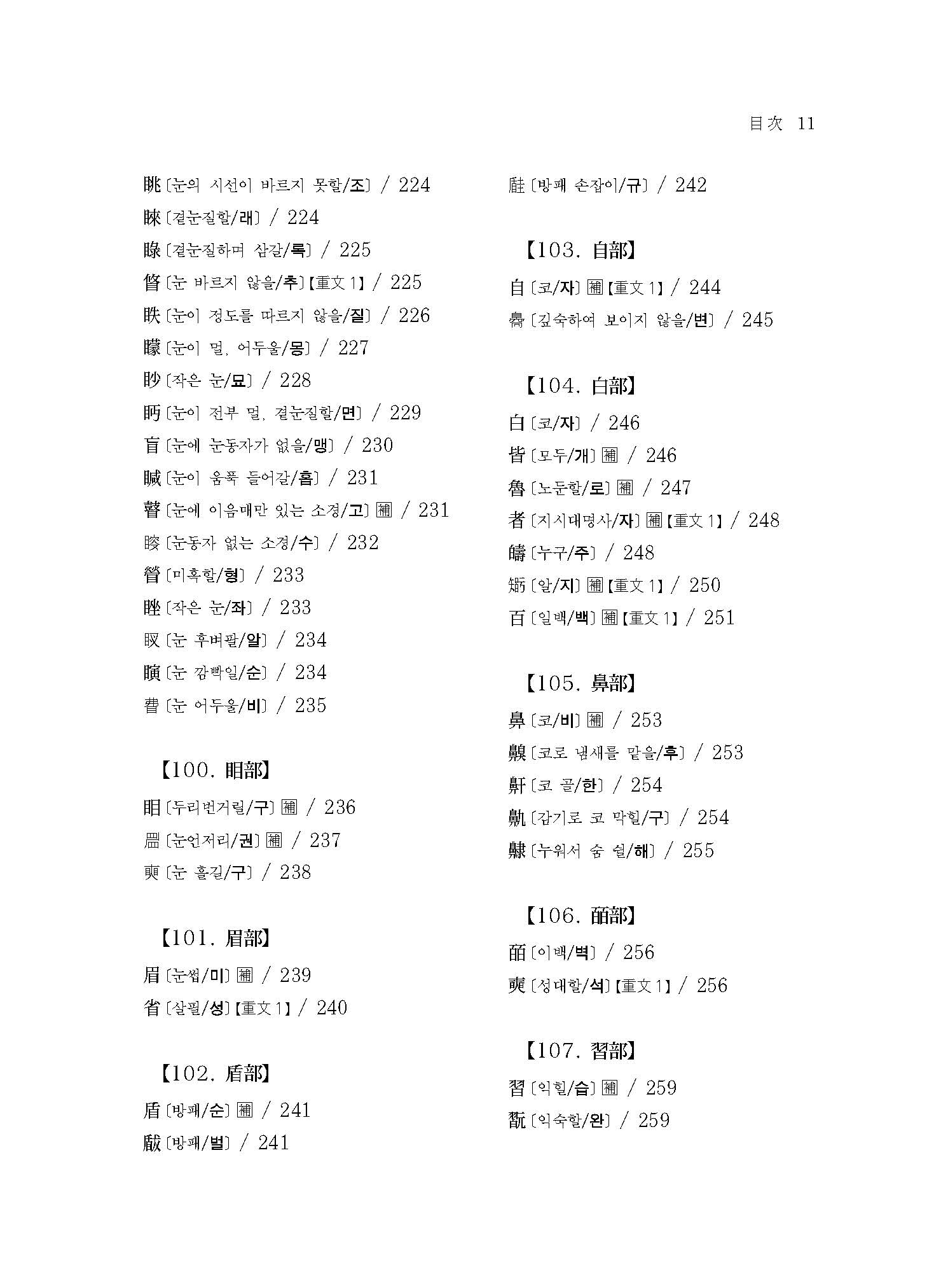 오늘날 널리 사용되는 《옥편(玉篇)》을 구성하고 있는 부수는 일(一)부에서 약(?)부까지 총 214개의 부수로 구성되어 있다. 이는 획의 순서에 따라 점층적으로 순서를 잡아 나열한 결과이다. 하지만 《설문해자》의 부수 나열 방식은, 오늘날 《옥편》에서 제시하고 있는 방식과 매우 달라 부수가 바뀌더라도 바로 앞에 제시한 부수와 밀접한 관계를 가진다.