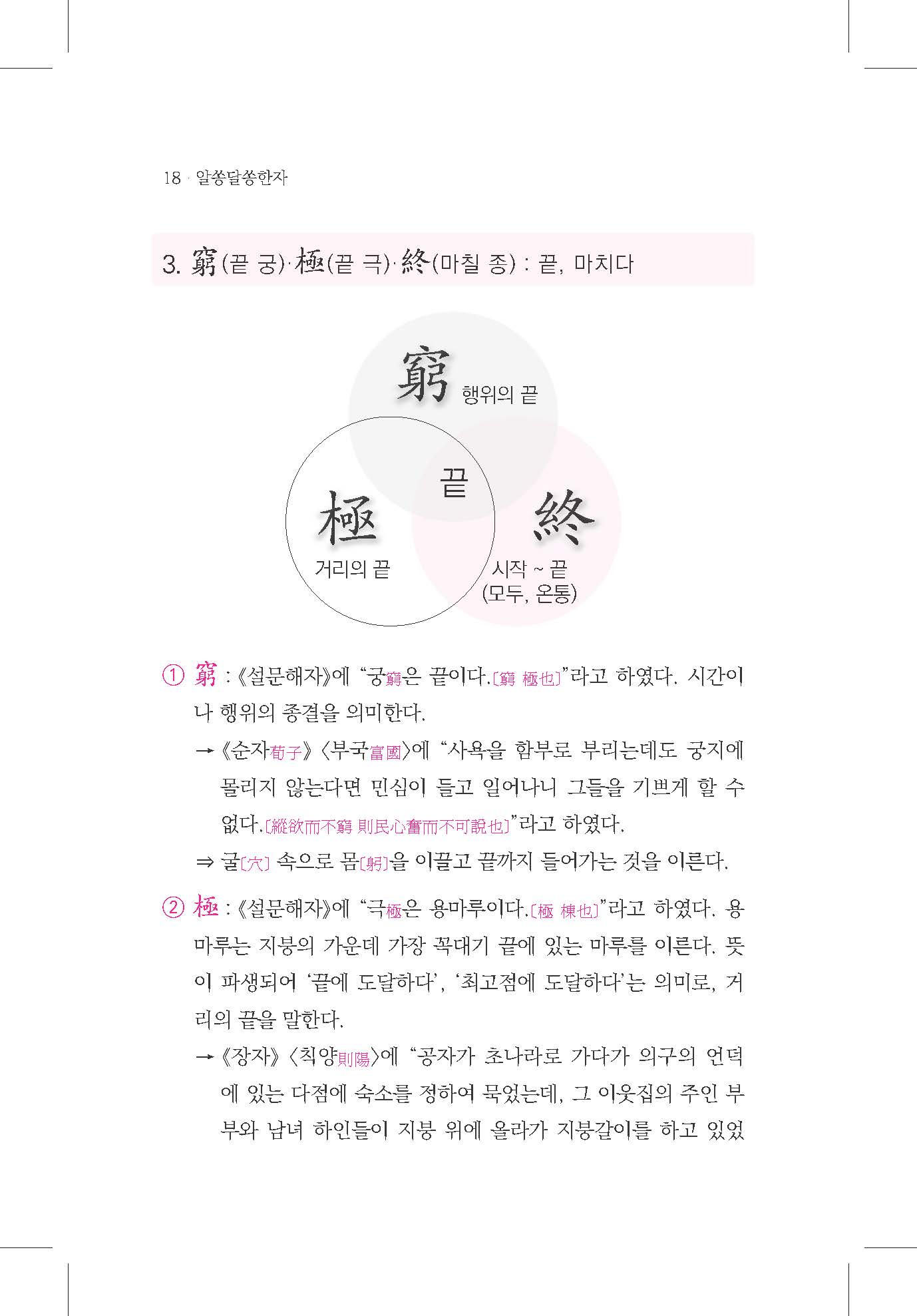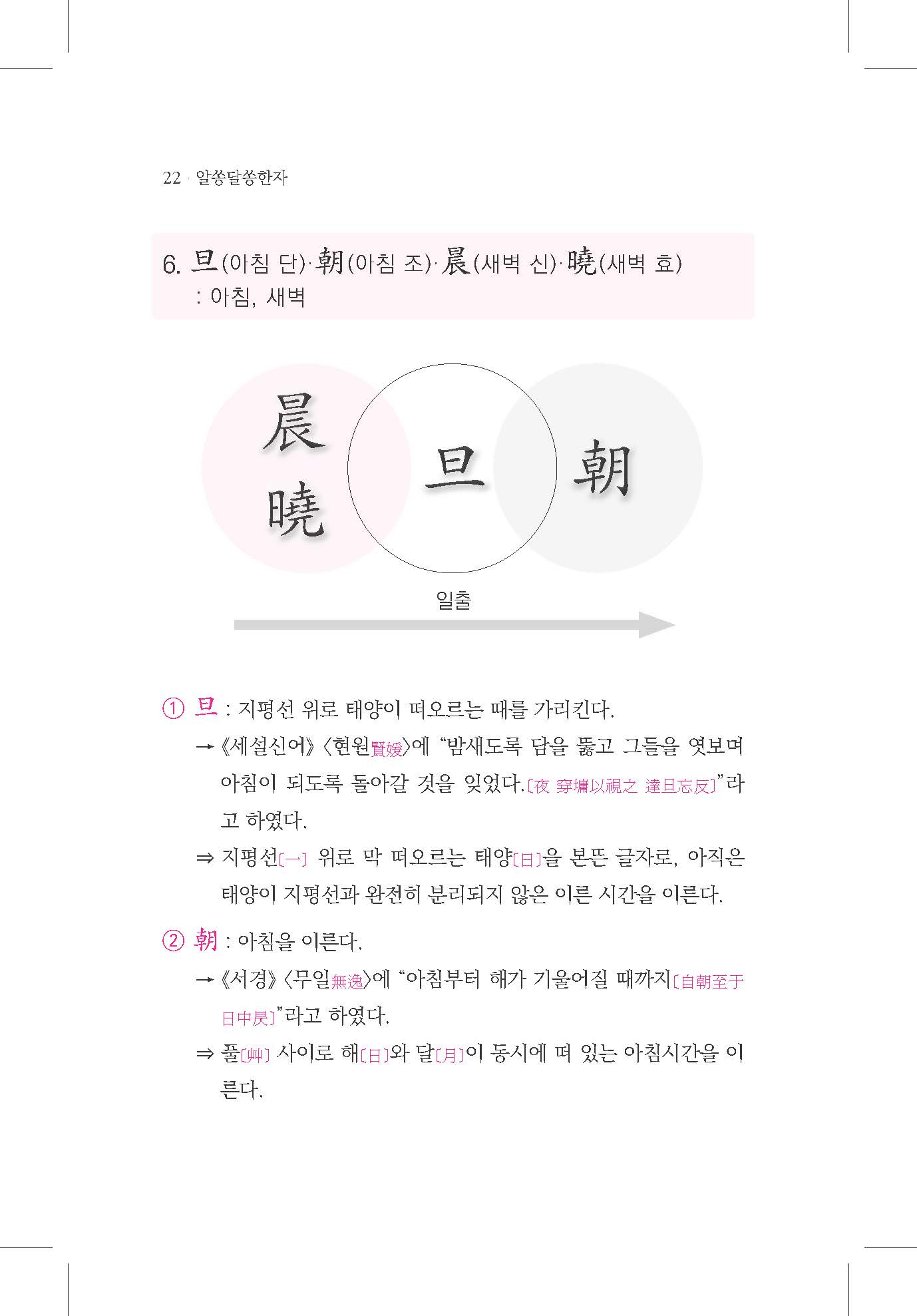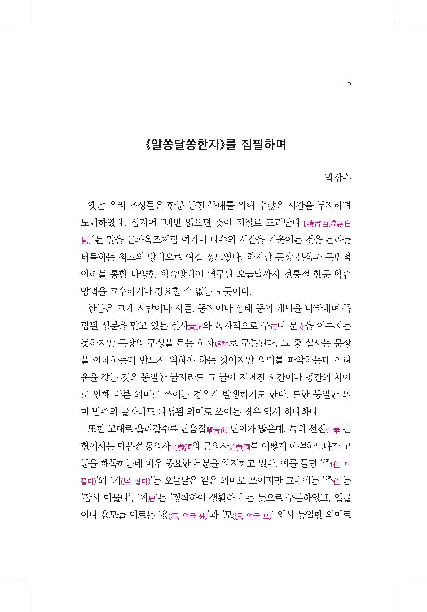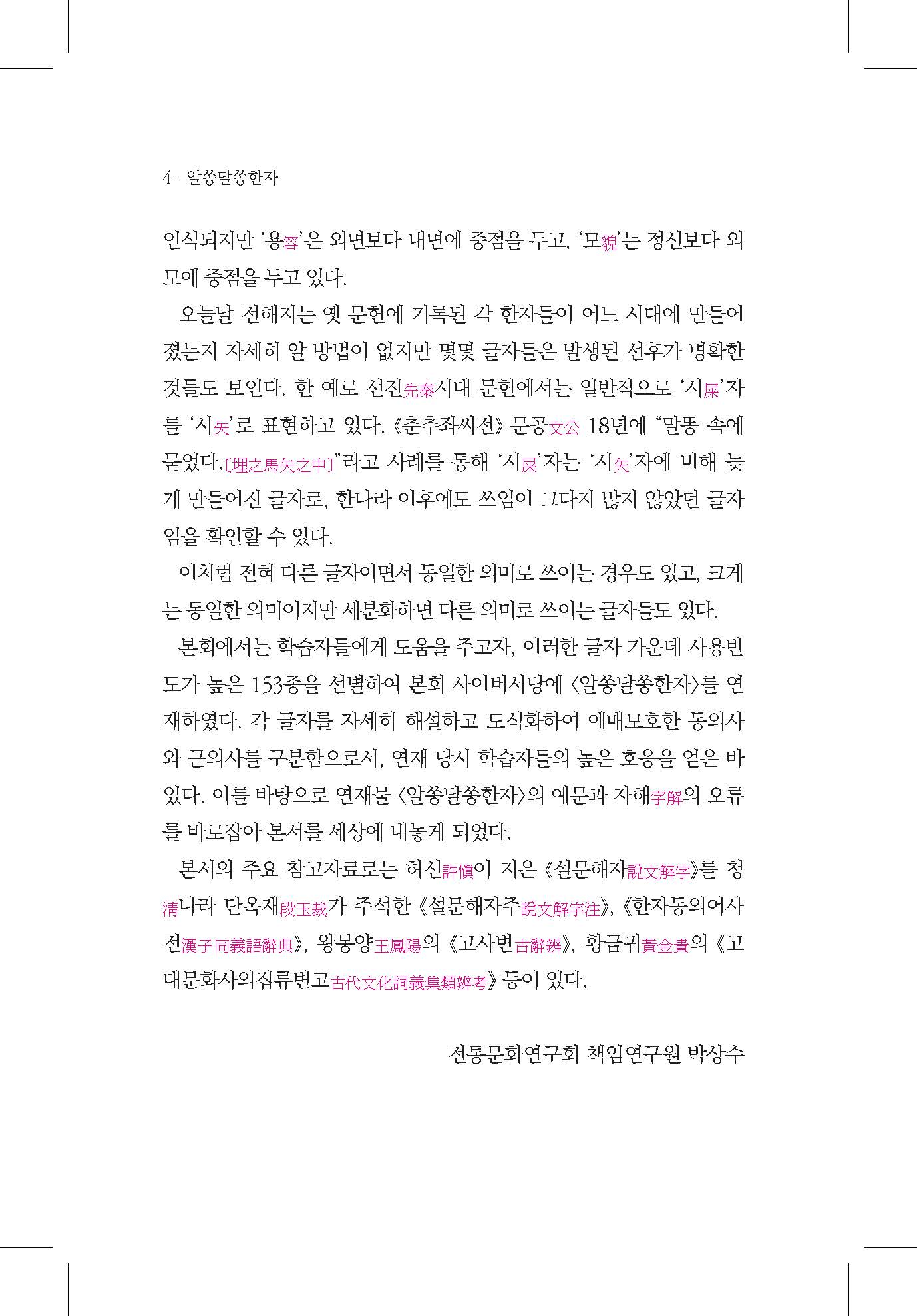 『알쏭달쏭 한자』는 한문 독해 과정에서 자주 혼동되는 동의어·근의어 한자 153종을 선별하여 그 의미 변천과 맥락적 차이를 체계적으로 해설한 연구서입니다. 한문은 실사와 허사로 나뉘며, 특히 실사는 문장의 의미를 파악하는 핵심 요소입니다. 그러나 동일한 글자라도 시대나 문맥에 따라 다른 의미로 쓰이거나, 같은 의미 범주 안에서도 세부적으로 구분되는 경우가 많습니다. 이러한 미묘한 차이를 도식화와 예문을 통해 시각적으로 제시하여 고문 독해의 정확성을 높이고 학습자와 연구자 모두가 쉽게 이해할 수 있도록 구성되었습니다. 한문 교육 현장과 학술 연구, 강의 자료로 활용도가 높은 실질적 참고서가 될 것입니다.