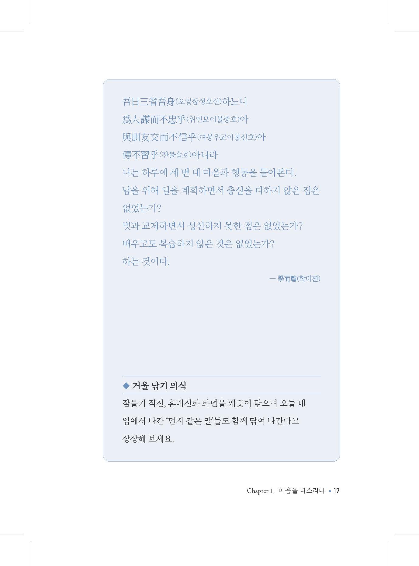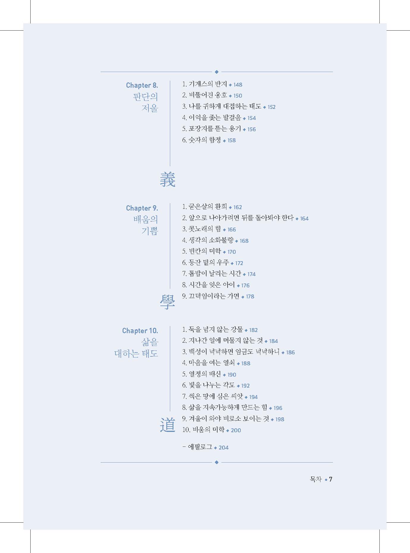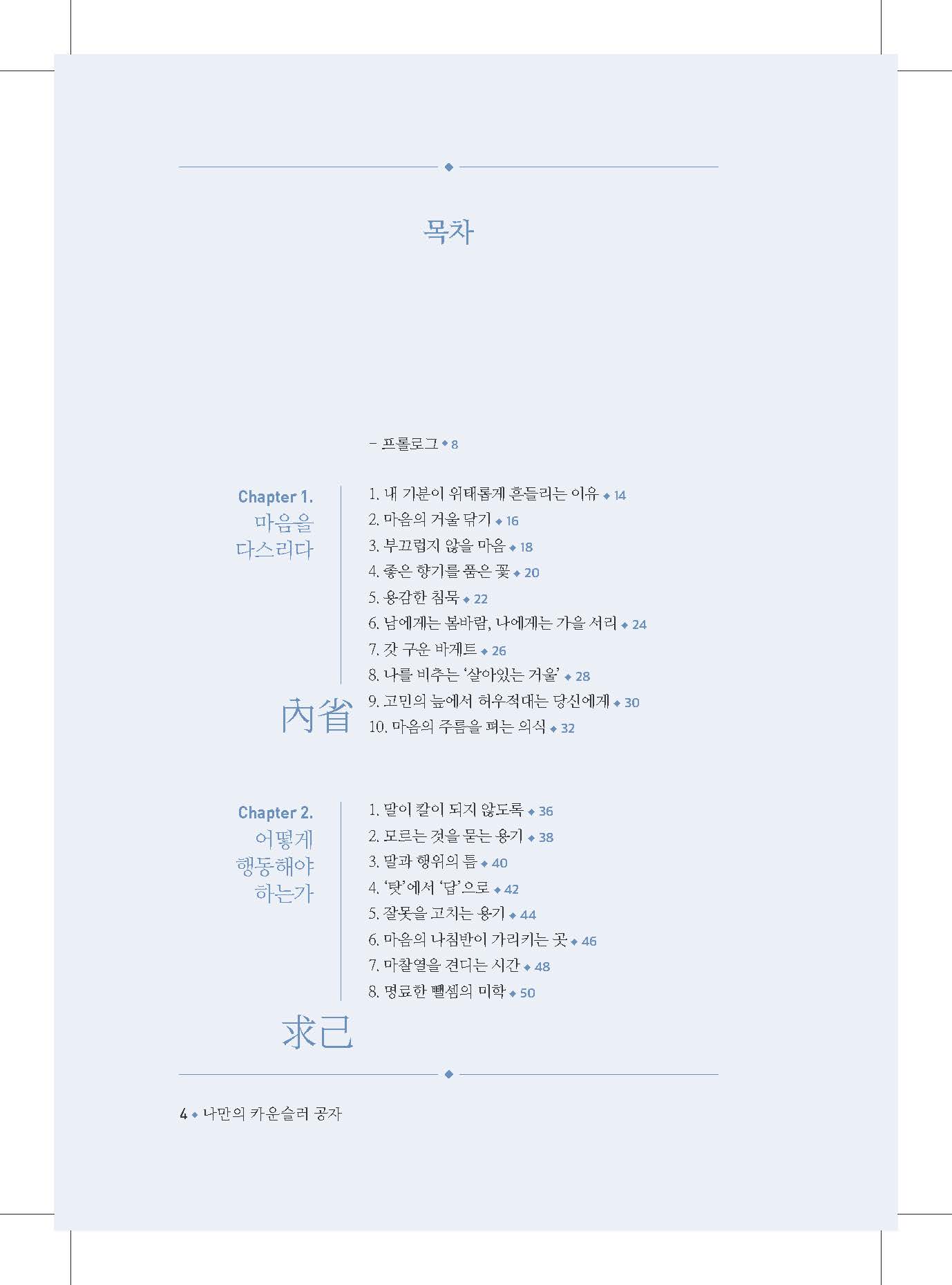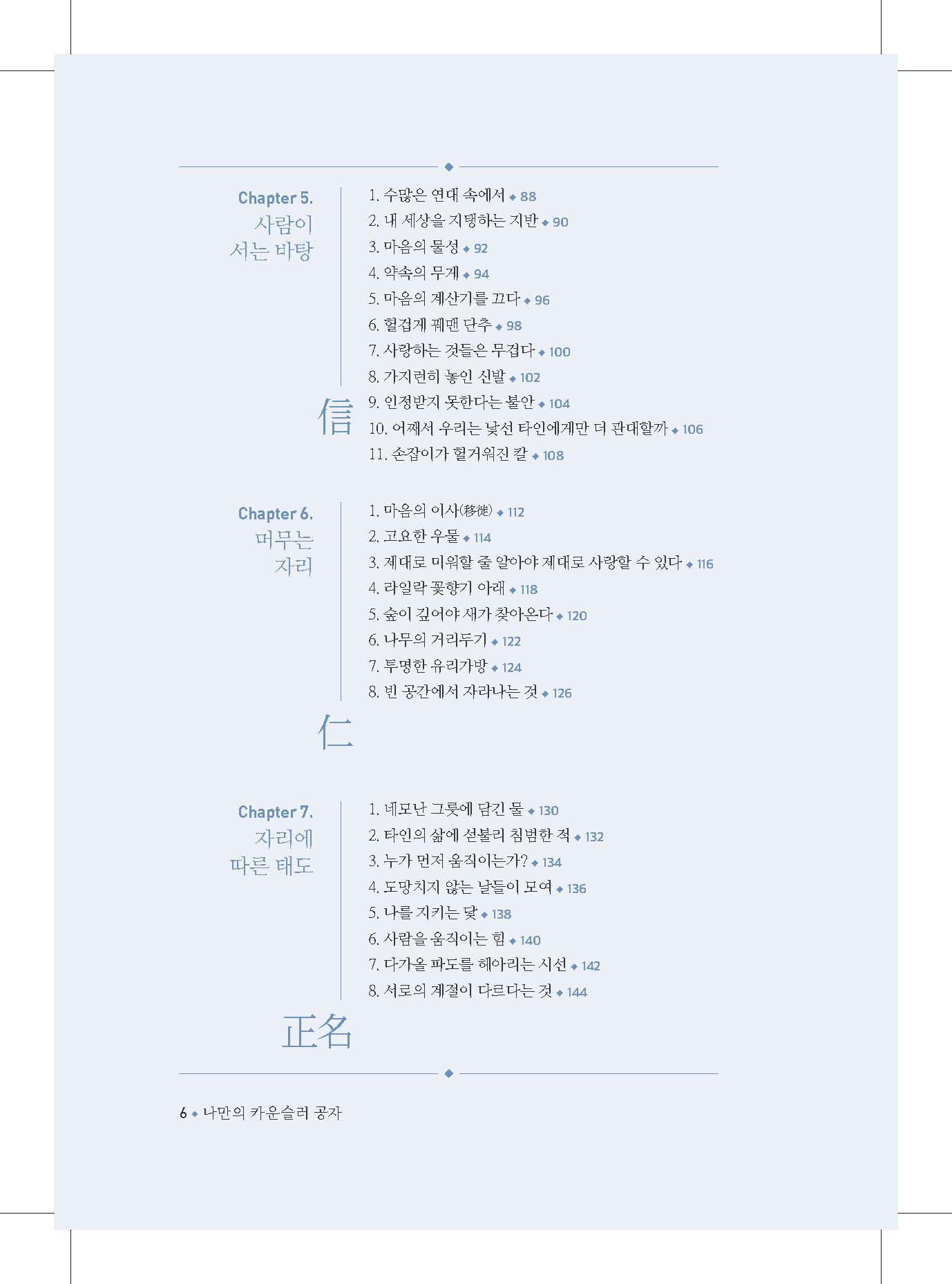 이 책은 딱딱한 학문적 해설서가 아닙니다. 저자가 직장 생활의 치열한 고민 속에서 길어 올린, ‘나를 지키는 문장’들을 담았습니다. 마음을 다스리는 법부터 복잡한 인간관계, 말의 무게까지. 삶의 흐름에 맞춰 재구성된 공자의 말들은 단순한 위로를 넘어, 삶의 기준을 세워주는 든든한 버팀목이 됩니다.
