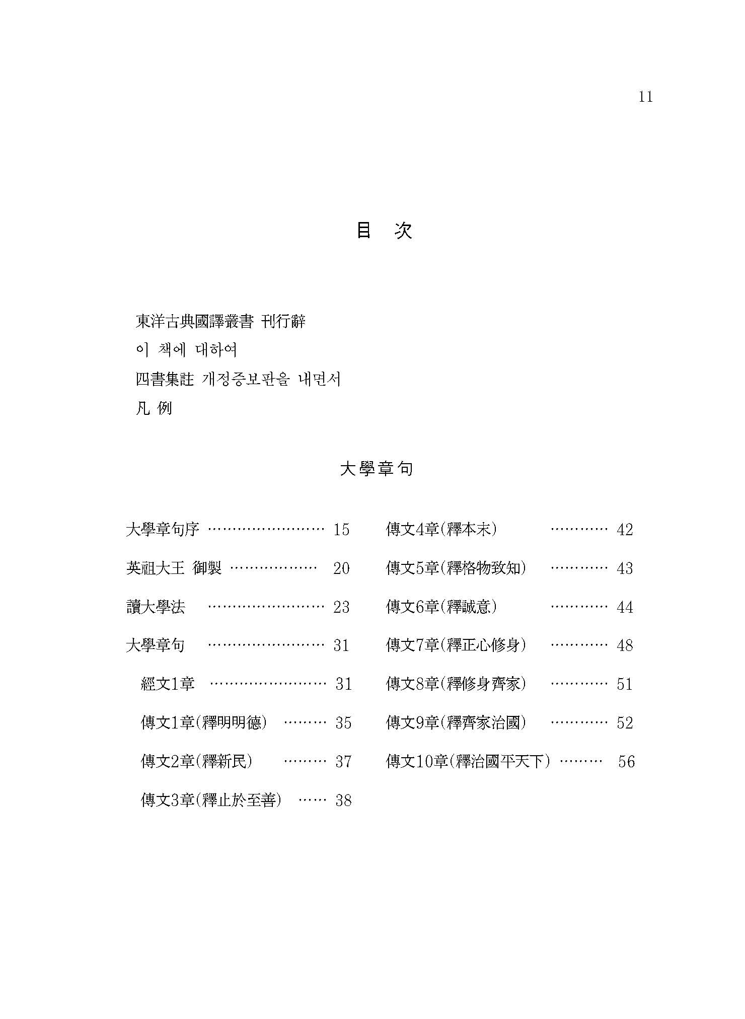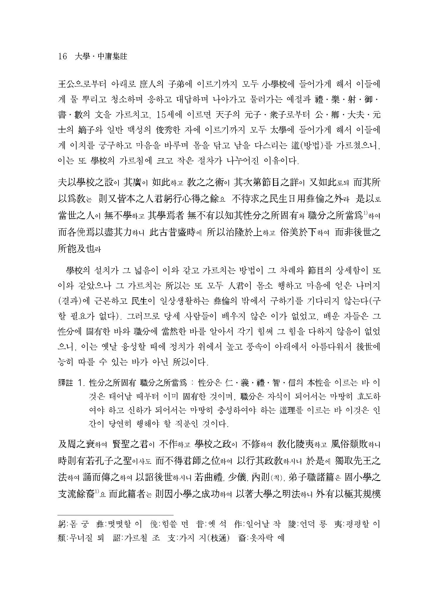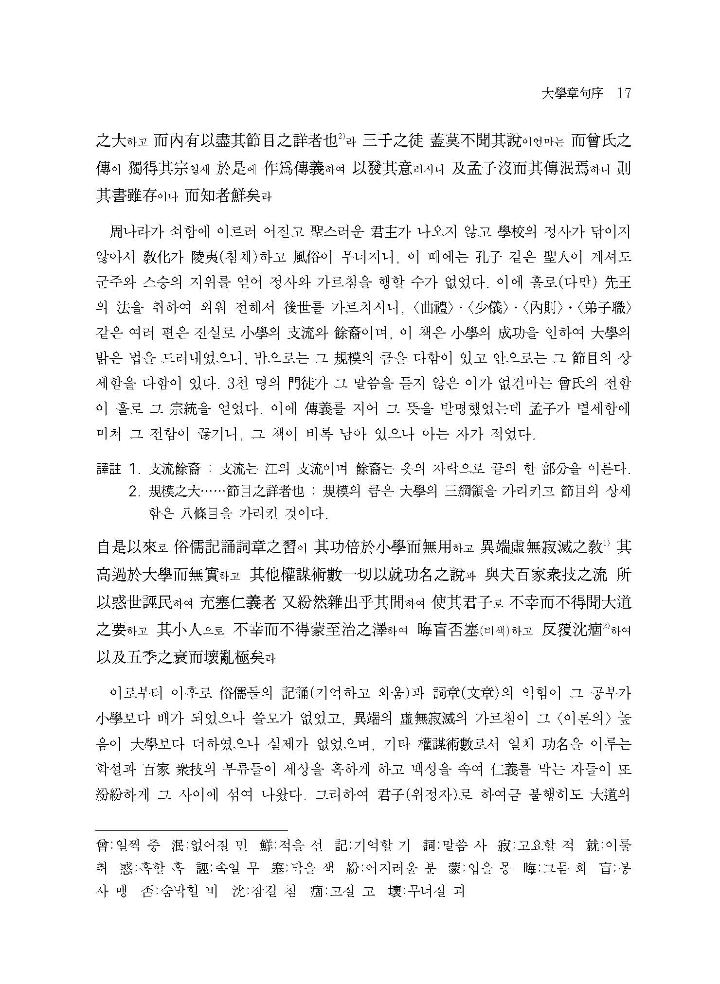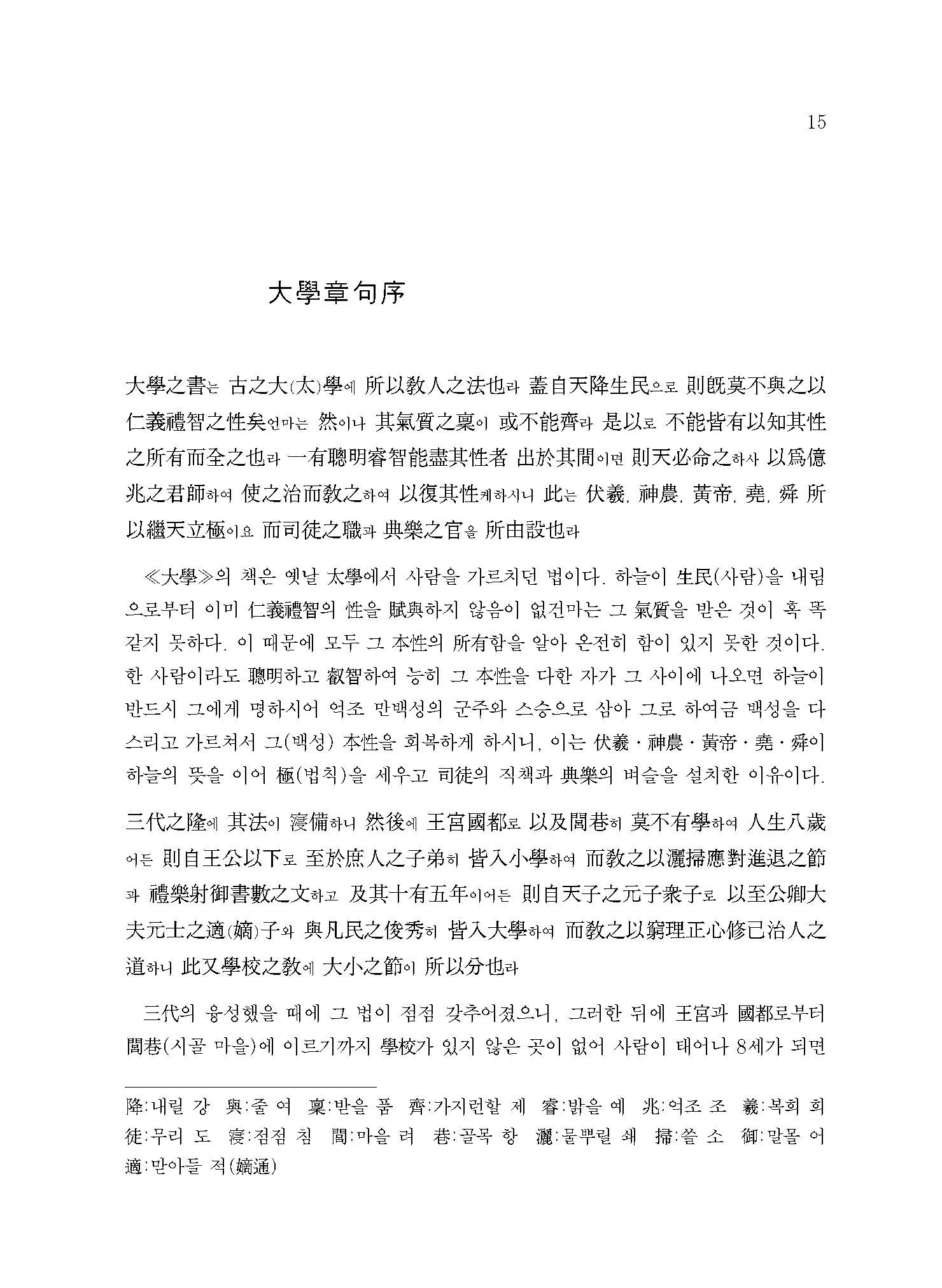 주자가 四書 중 가장 심혈을 기울여 정리한 대학과 중용장구는 조선시대 임금의 필독서였다. 대학은 帝王學으로서 중용은 心學으로서 표리를 이루었으며, 본서는 집주까지 완벽하게 현토하고 해석한 현토완역본이다.