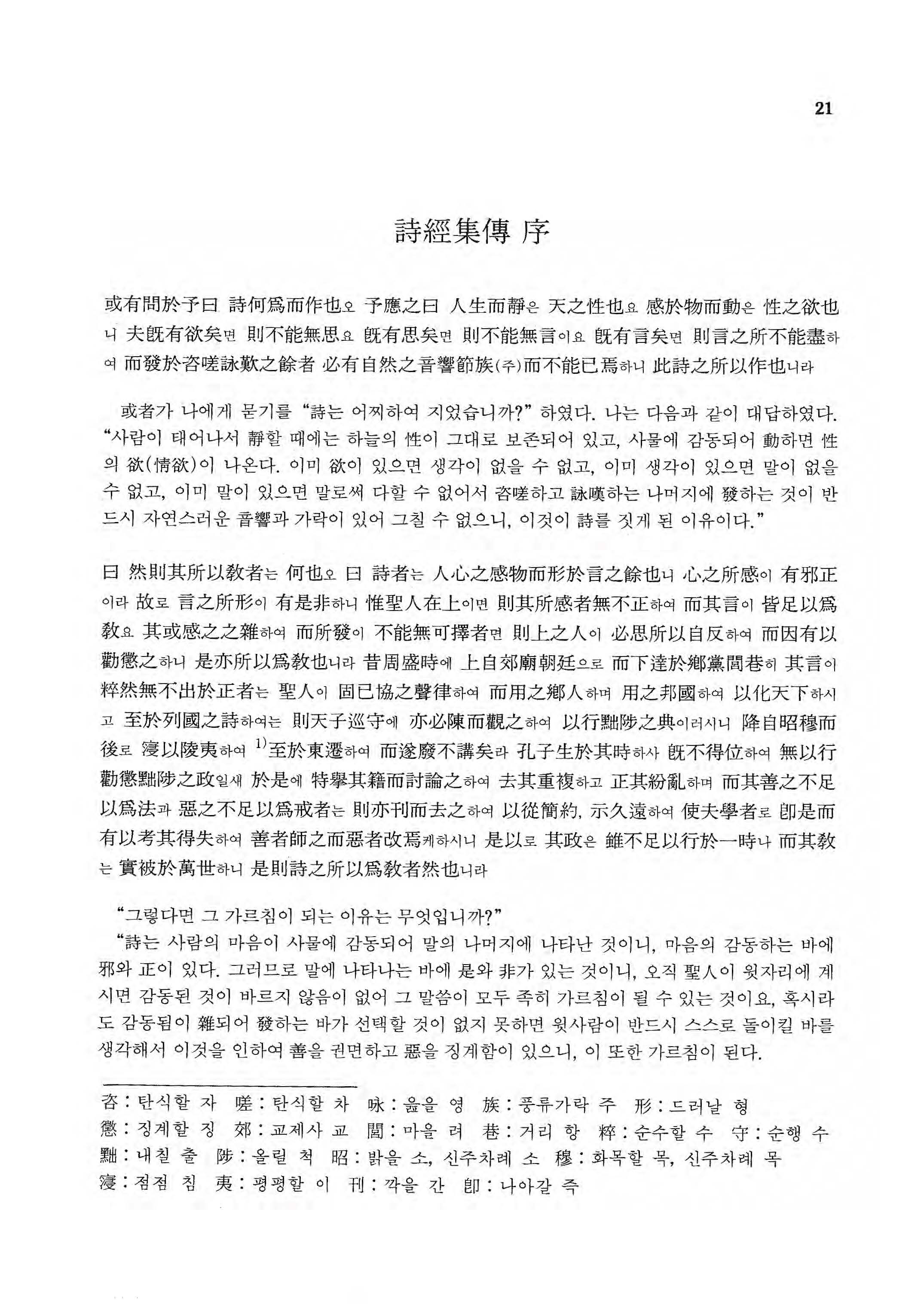 공자의 이 한마디는 시경의 중요성을 충분히 말해주고 있다. 본서는 시경의 본문 뿐만 아니라 집전까지 상세하게 현토하고 직역하였으며, 특히 운자를 표기하여 시를 외우면서 용운까지 아울러 익히도록 배려하였다.