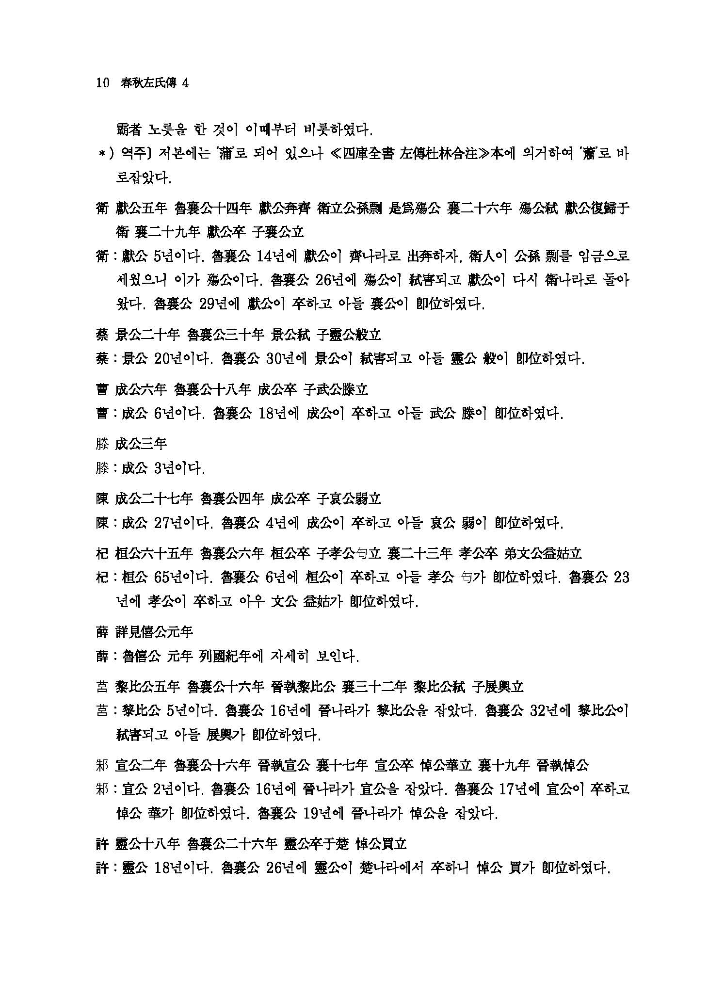 이 ≪좌씨전≫에 대한 註釋書는 수없이 많으나, 그 중에서도 晉나라 두예(杜預)의 注, 唐나라 공영달(孔穎達)의 소(疏)와 근대 중국 학자 양백준(楊伯峻)의 주석이 대표적이라 할 수 있다. 번역의 臺本은 조선 世宗 때 集賢殿 學士들이 王命을 받아 두예주(杜預注)를 위주로 삼고 임요수(林堯叟)와 주신(朱申)의 설을 附注하여 편찬해 출간한 內閣本을 底本으로 삼았다. 이 번역을 위하여 韓國文集叢刊(한국고전번역원 간행)과 ≪韓國經學資料集成≫(성균관대 대동문화연구원 간행)을 참고하여 우리 나라 先學들의 註說이나 辨證을 譯註로 소개하였고, ≪春秋左傳正義≫(十三經注疏本)를 참고해 誤脫字를 訂補하였으며, 서울대학교 奎章閣 소장본인 ≪春秋經傳集解≫의 懸吐를 참고하여 經과 傳에 懸吐함으로써 原典의 이해를 도왔다.